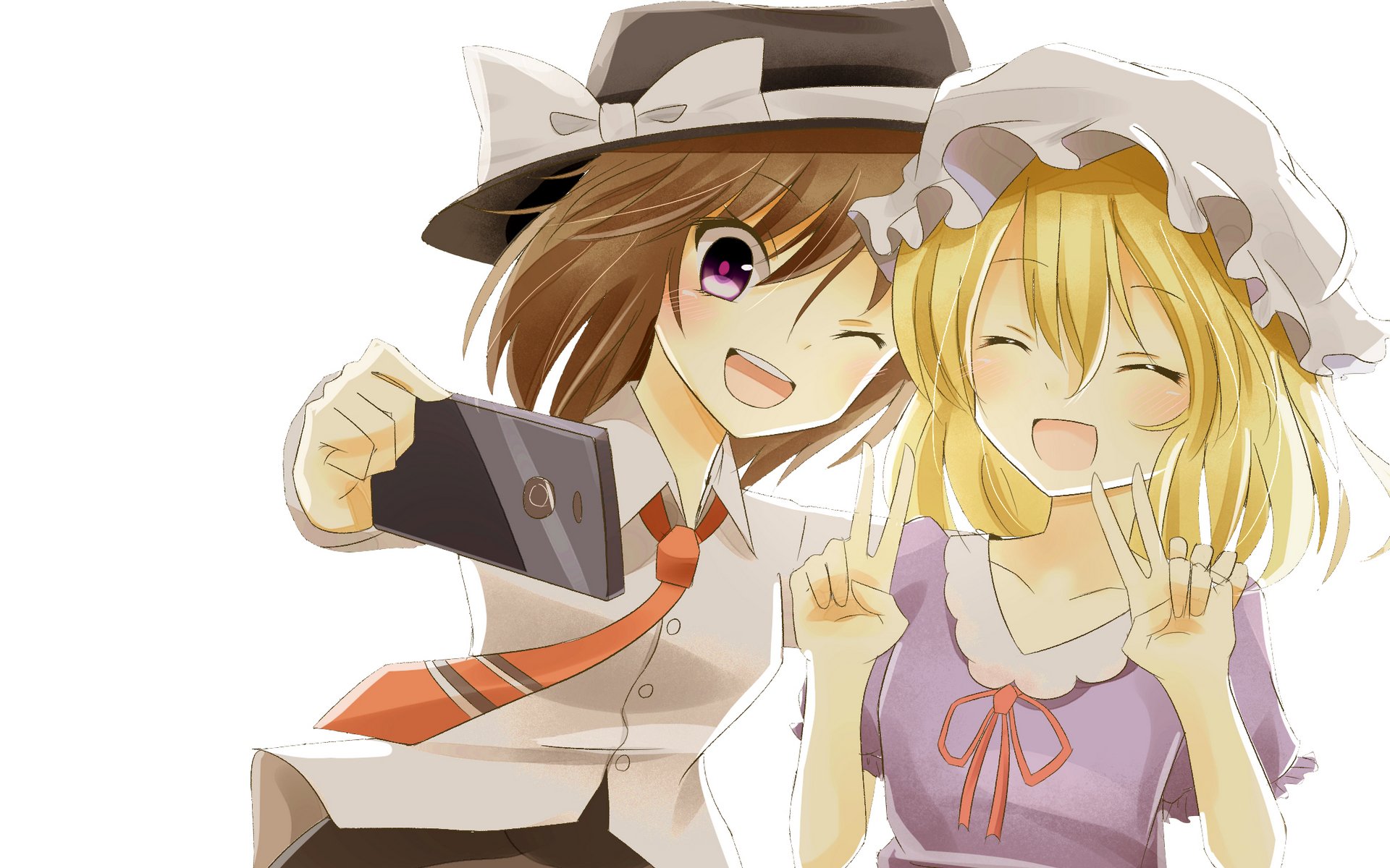 Description: A couple of people that are standing up together with a cell phone in their hand and a hat on their head.
