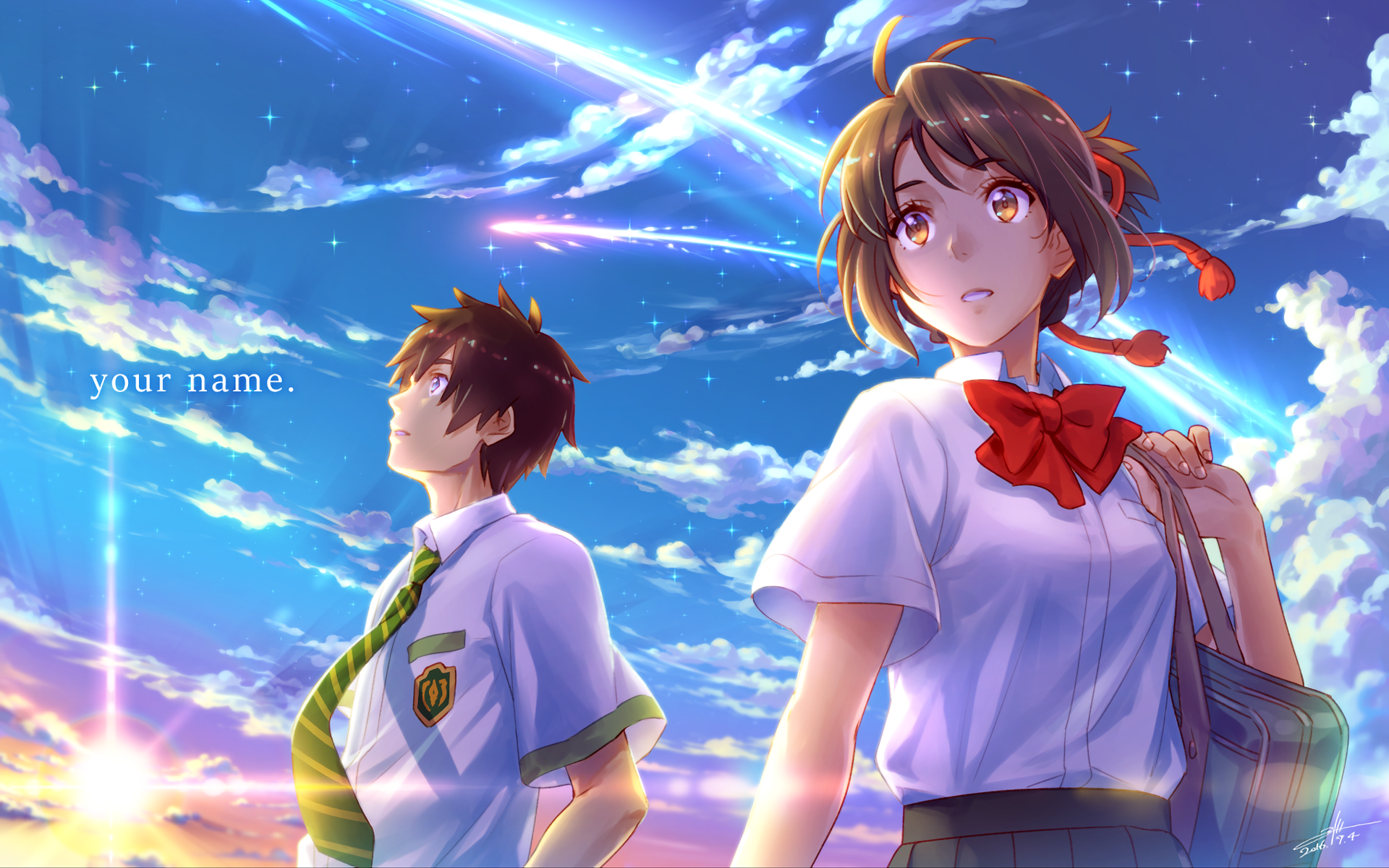 Description: A couple of people standing next to each other under a cloudy sky with stars and clouds behind them.