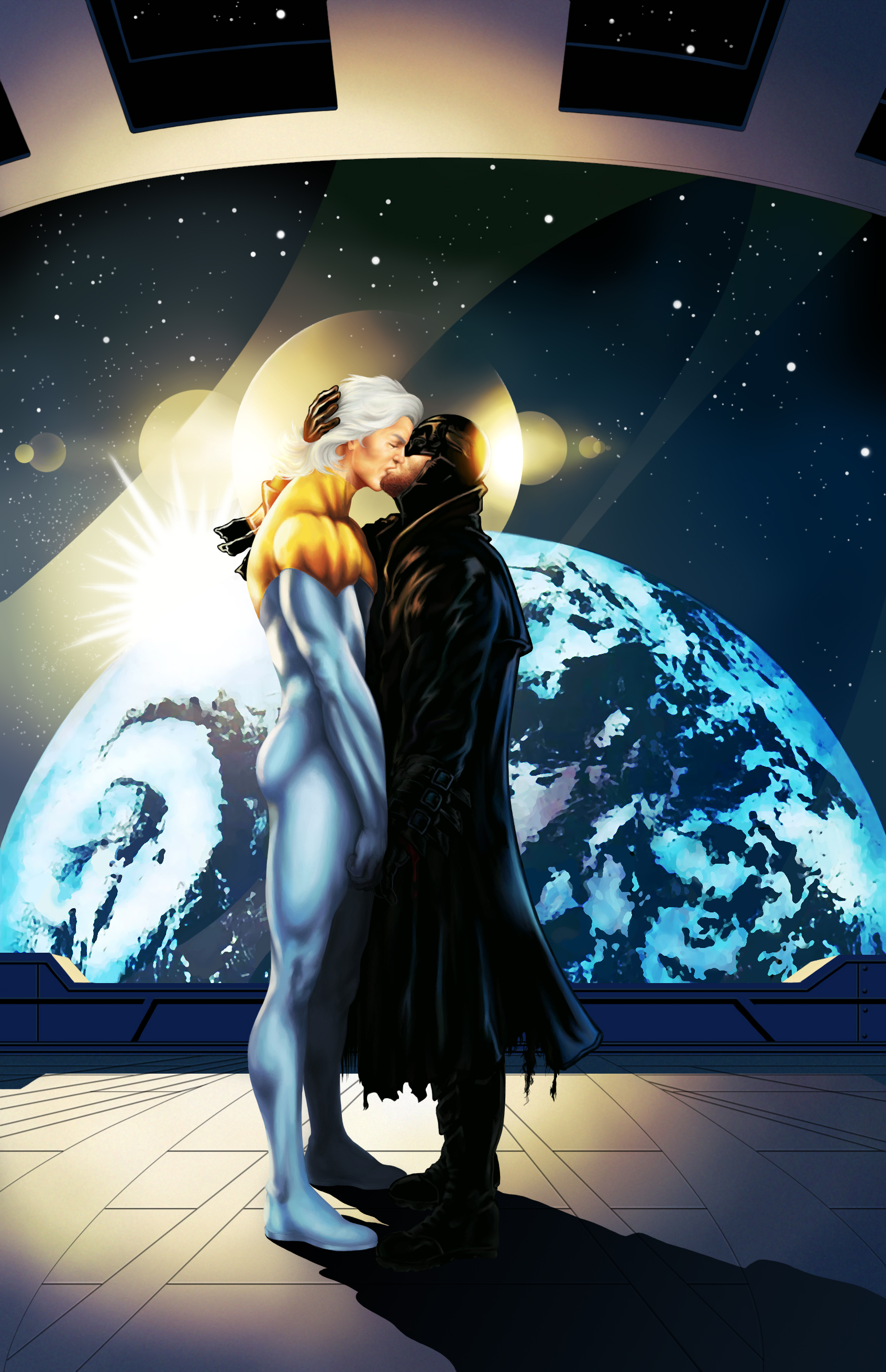 Description: A couple of people that are standing in front of a picture of the earth and stars on the ceiling.