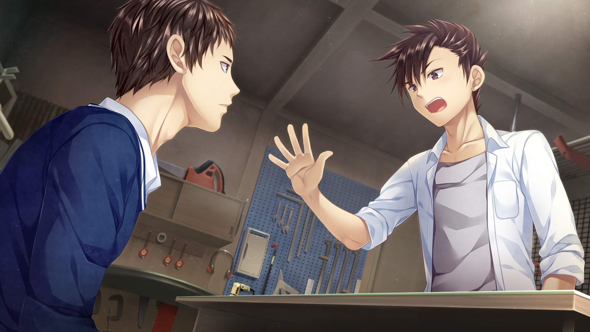 Description: A couple of people standing in a room with a table and a shelf with a clock on it and a light on.