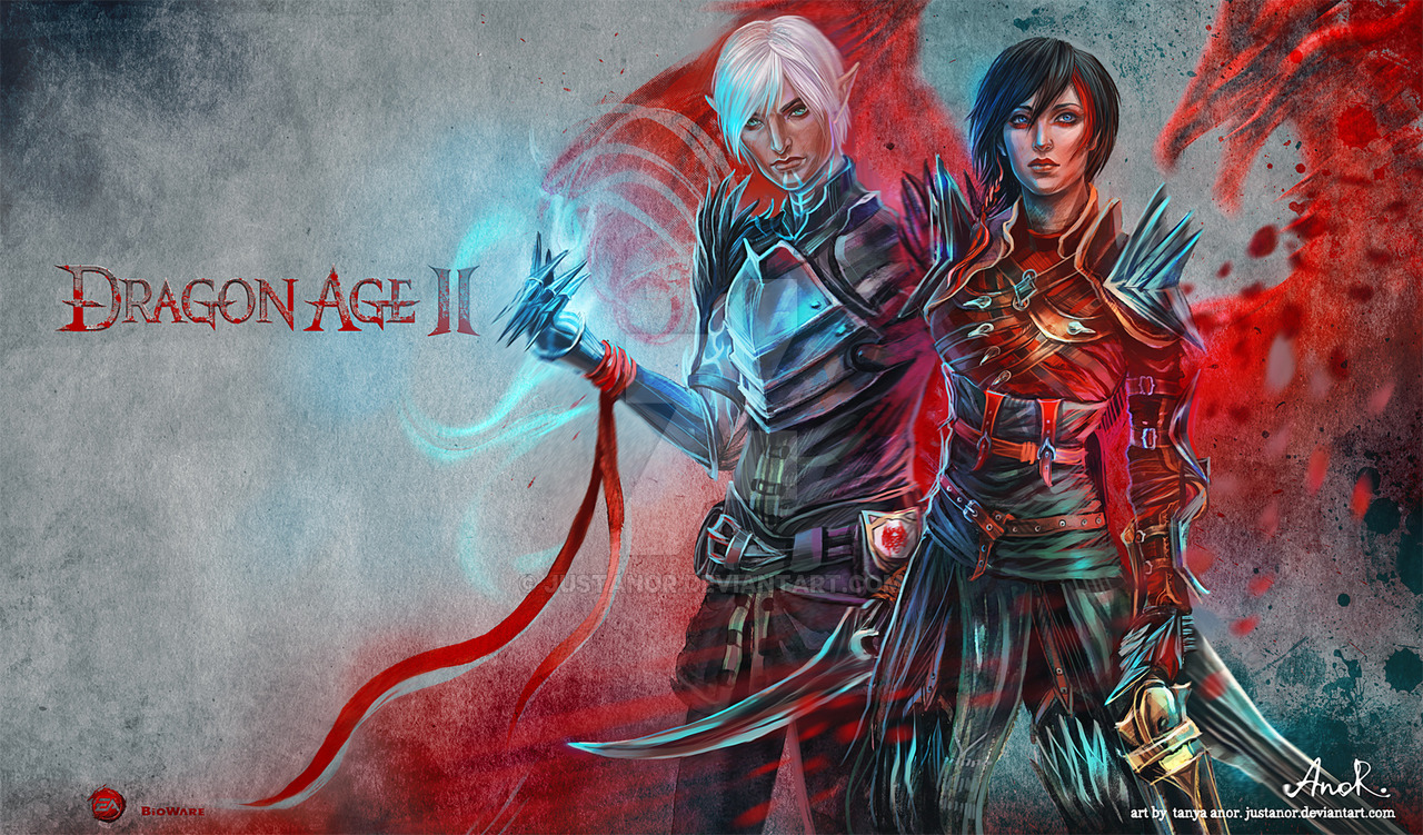 Description: A couple of people standing next to each other in front of a wall with a dragon age ii logo.
