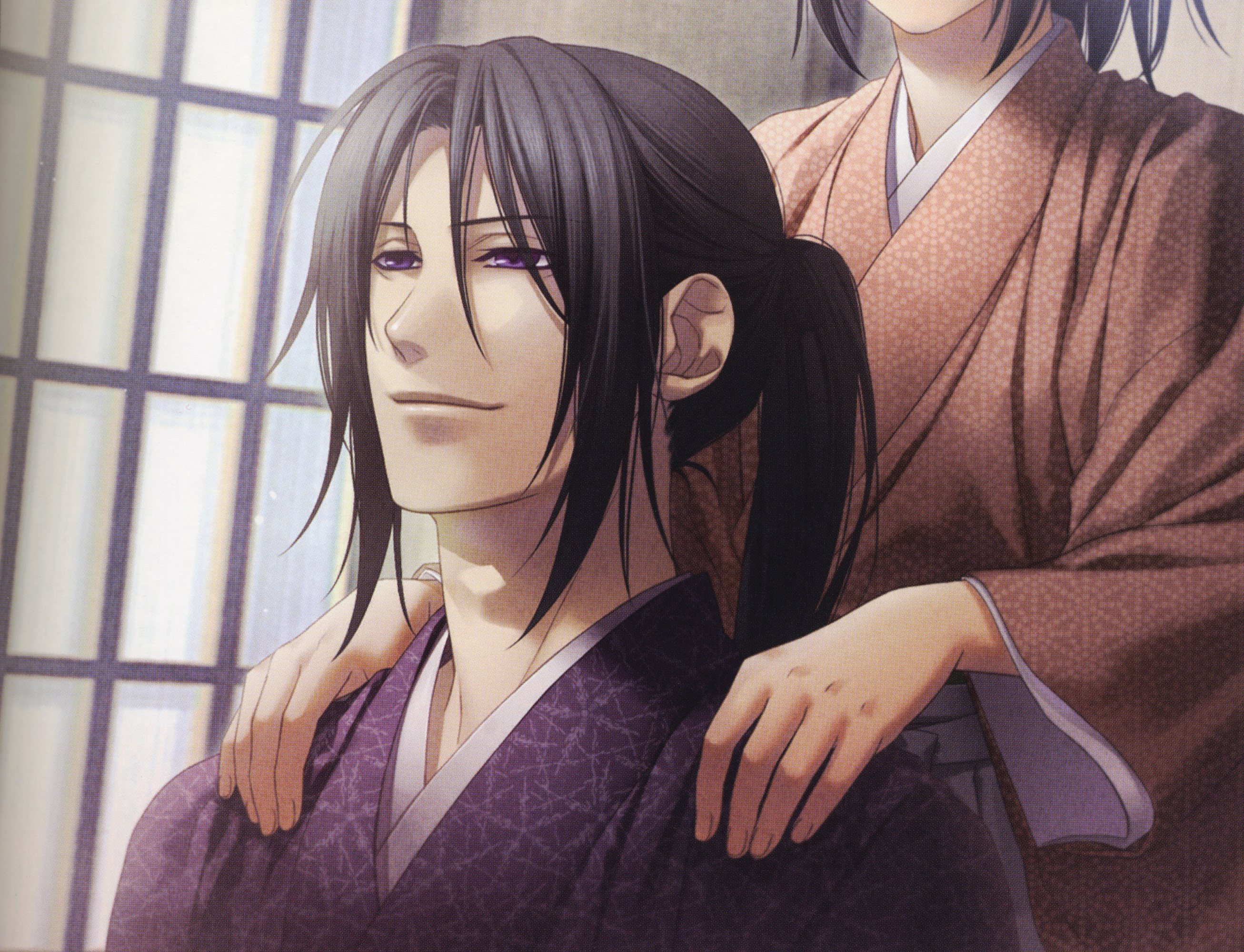 Description: A couple of people standing next to each other in front of a window with a curtain on the side.