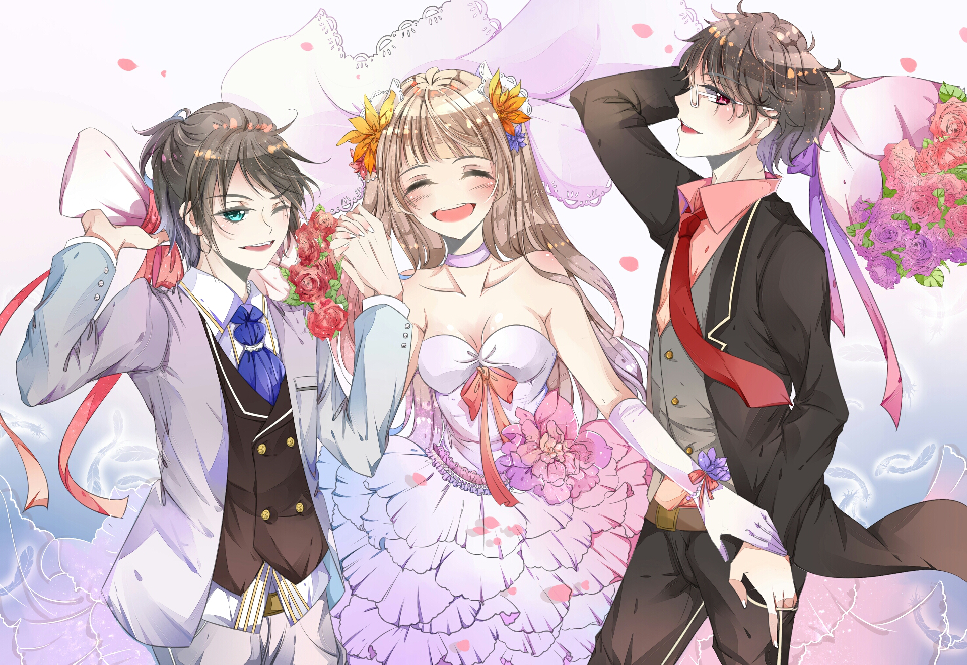 Description: A couple of people standing next to each other in front of a pink background with flowers on it and a man in a suit.