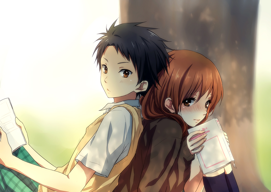 Description: A couple of people standing next to each other near a tree and a forest with a book in hand.