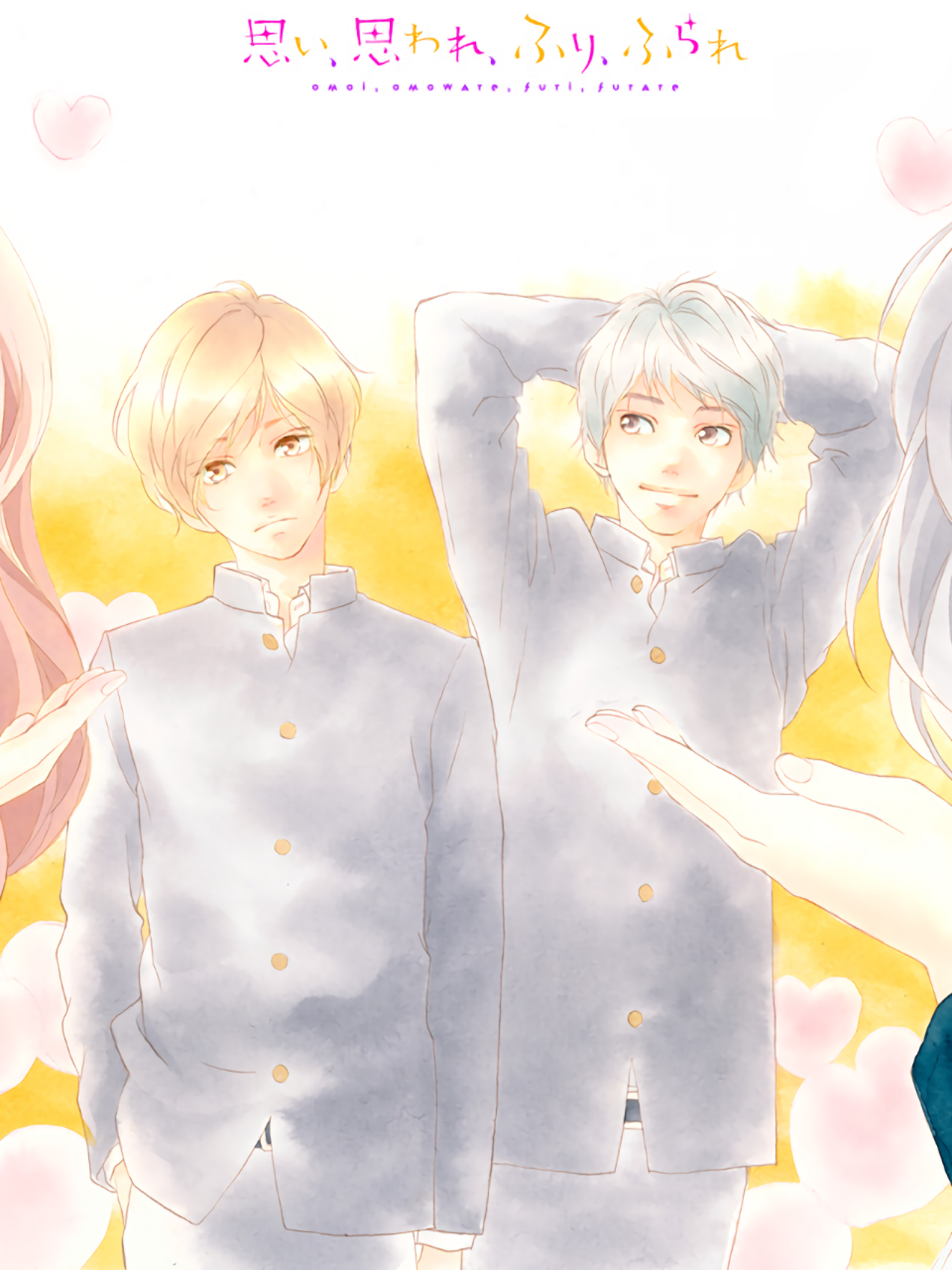 Description: A couple of people standing next to each other in front of a yellow background with clouds and hearts on it.