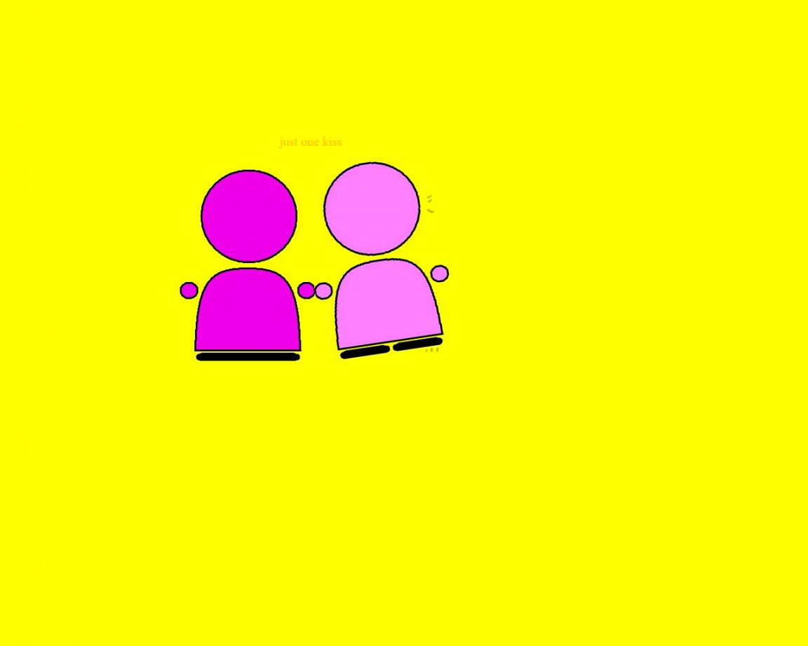 Description: A couple of people standing next to each other on a yellow background with a pink and purple outline on the left side of the image.
