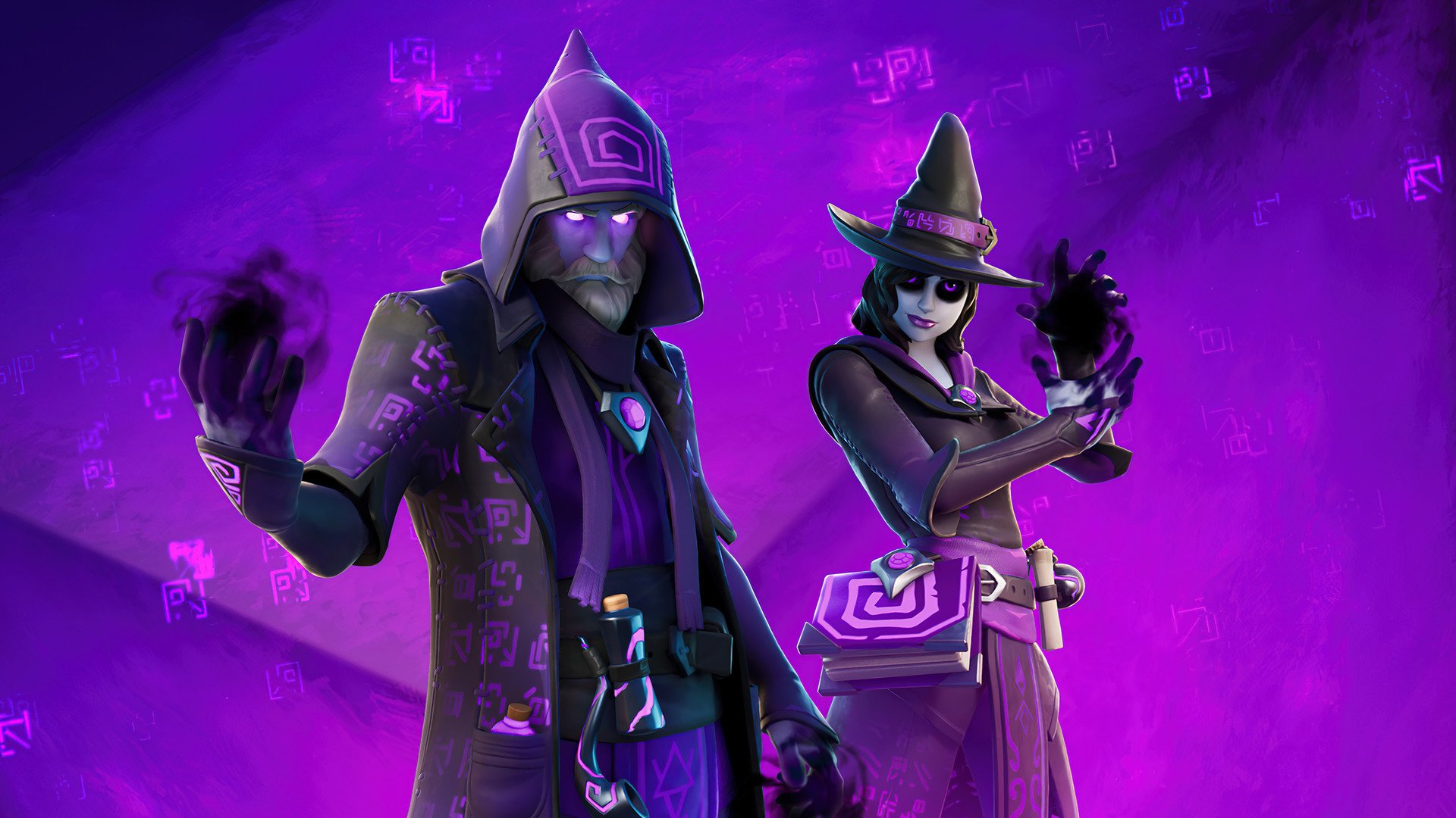 Description: A couple of people standing next to each other in front of a purple background with letters and symbols on it.