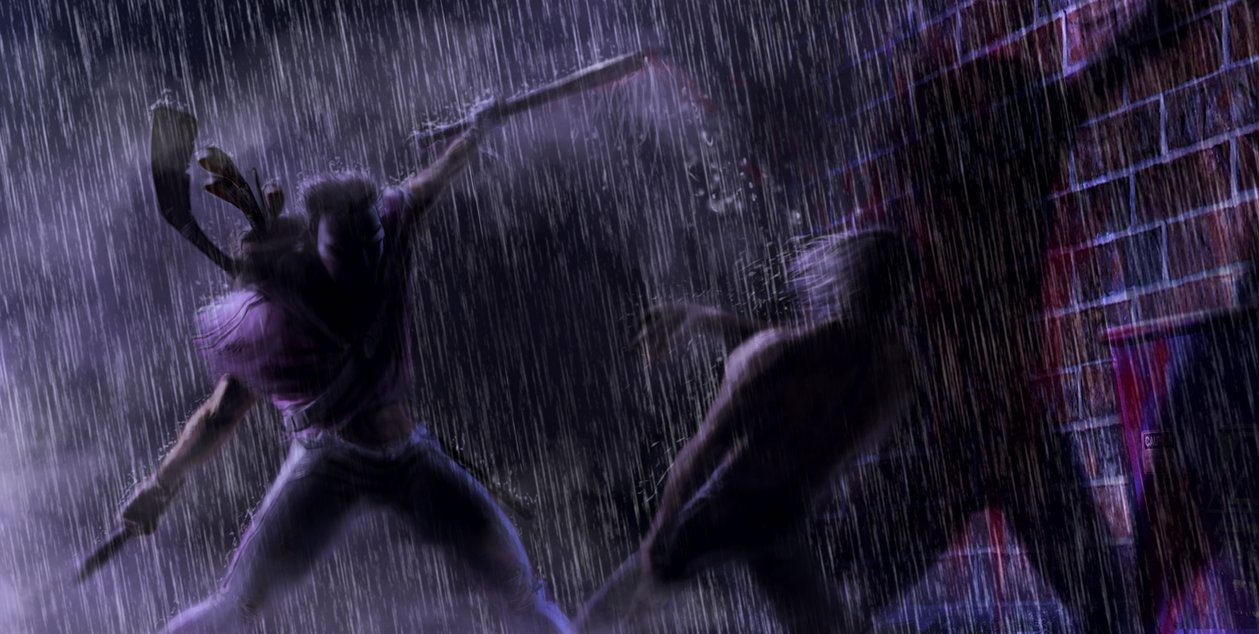 Description: A couple of people standing in the rain with an umbrella over them and a building in the background with a person holding an umbrella.