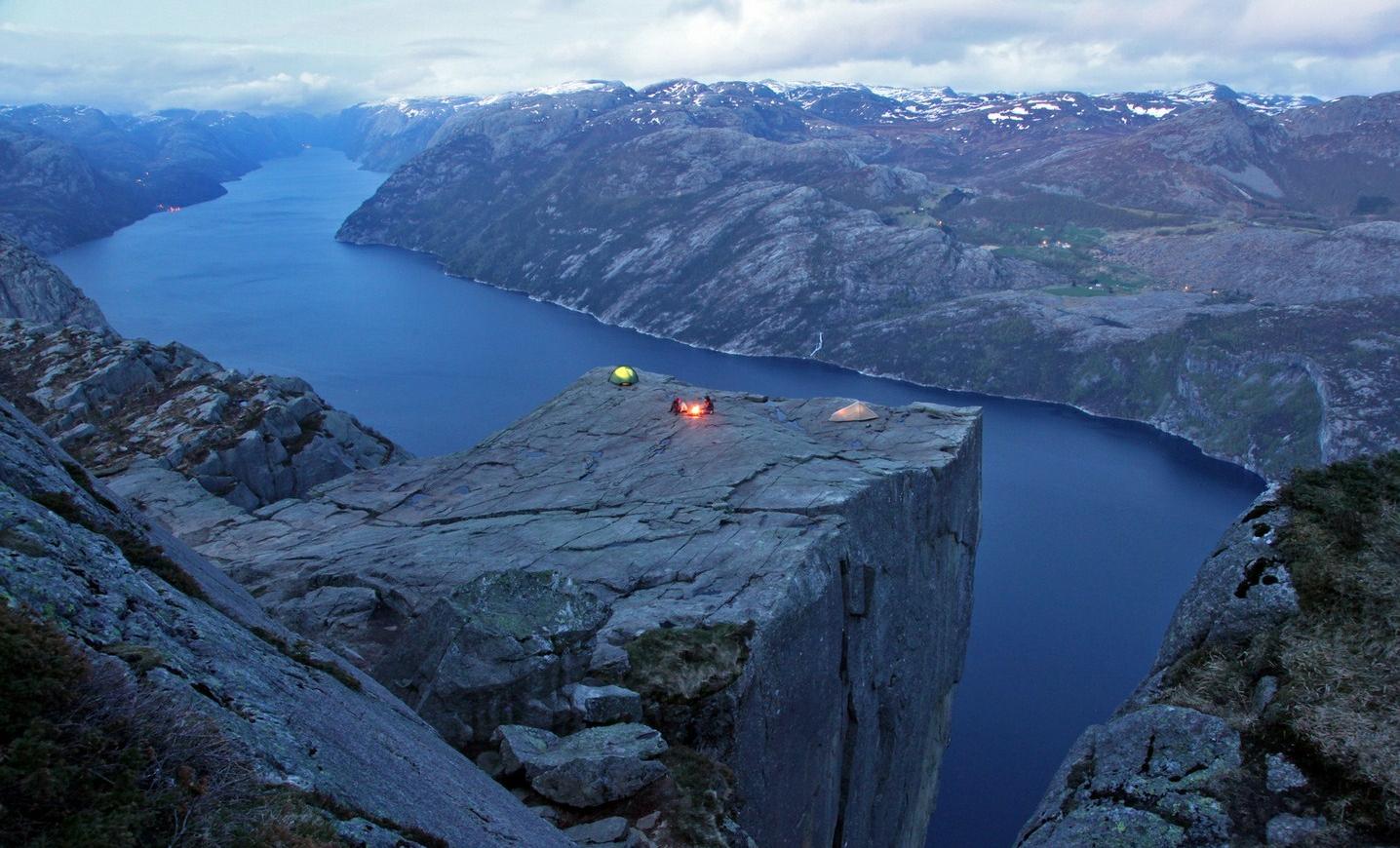 Description: A couple of people standing on top of a mountain next to a lake and mountains in the background with a sky.
