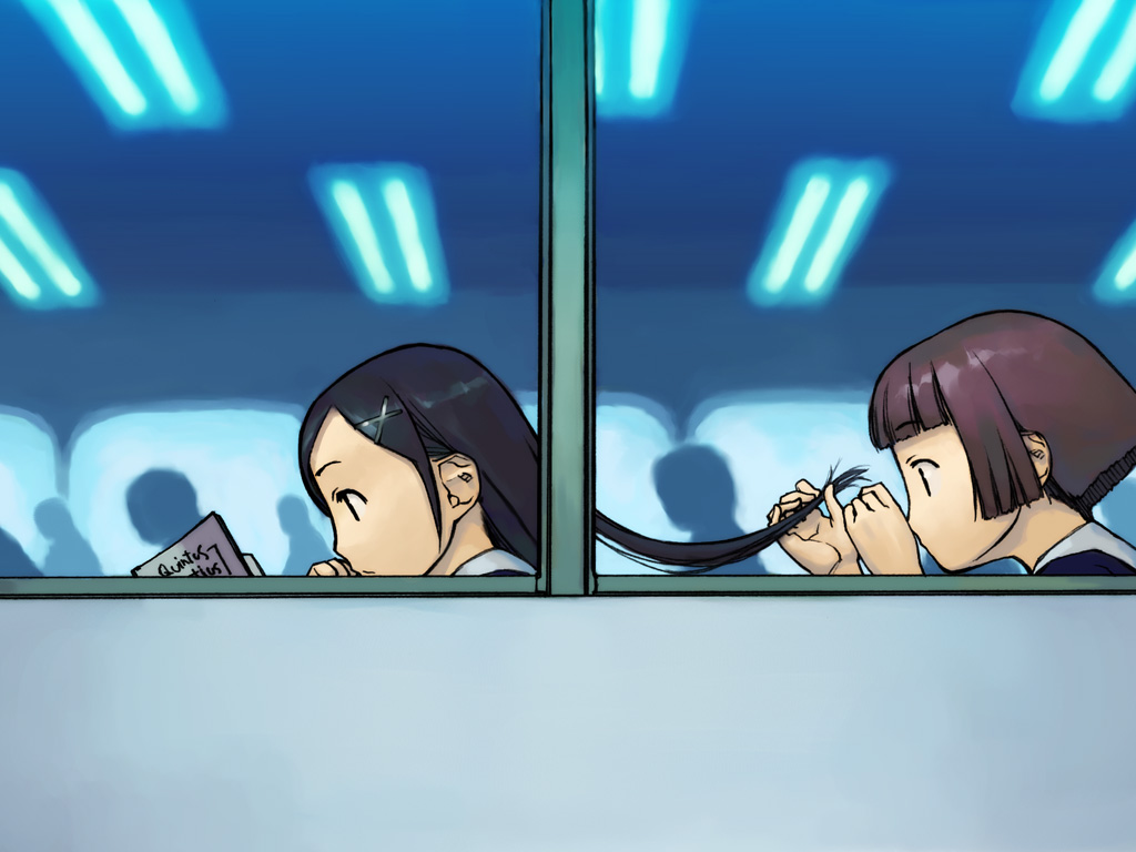 Description: A couple of people sitting in a train looking out the window at the sky and the lights on the ceiling.