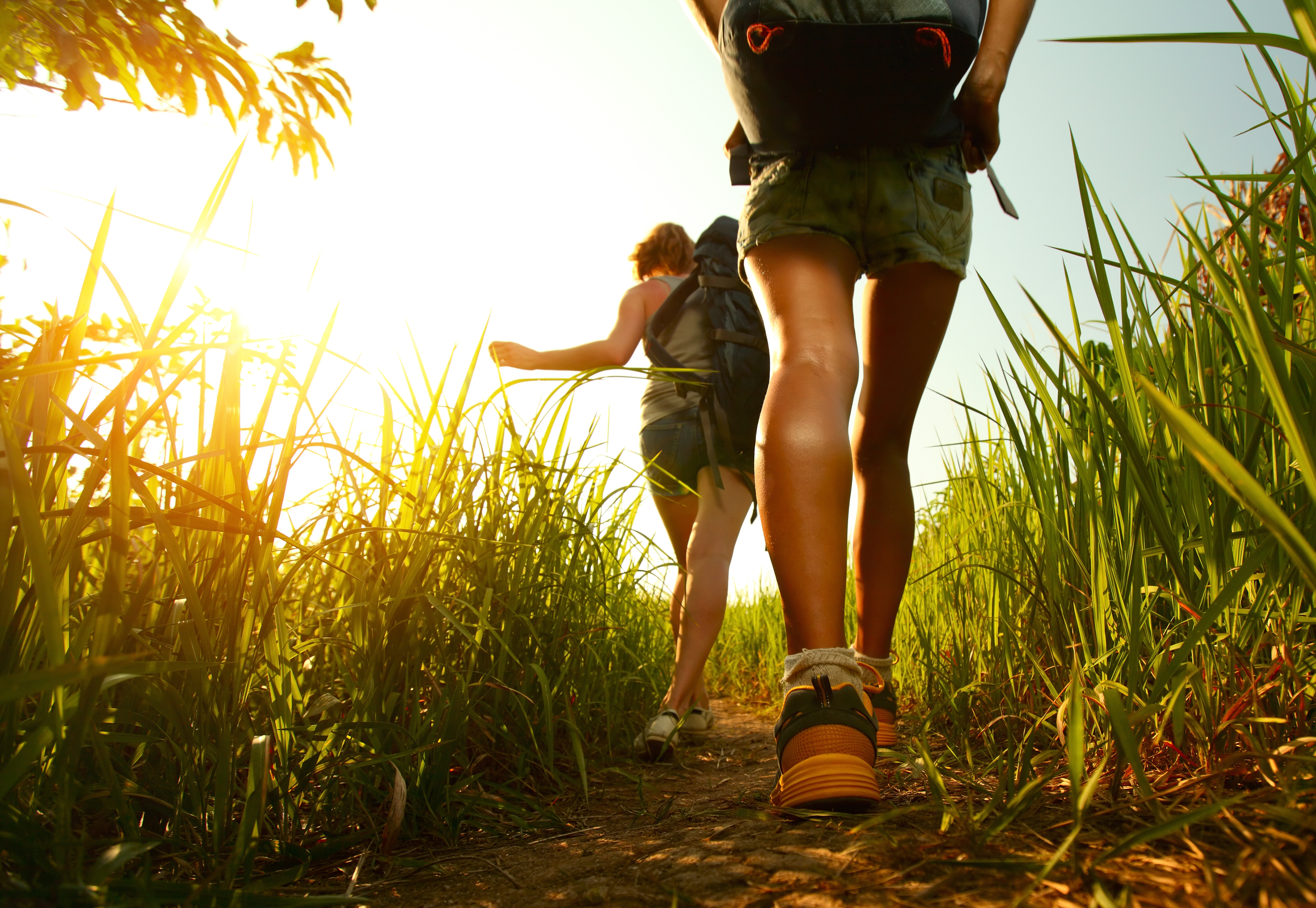 Description: A couple of people walking down a dirt road next to tall grass and plants on a sunny day with the sun shining.