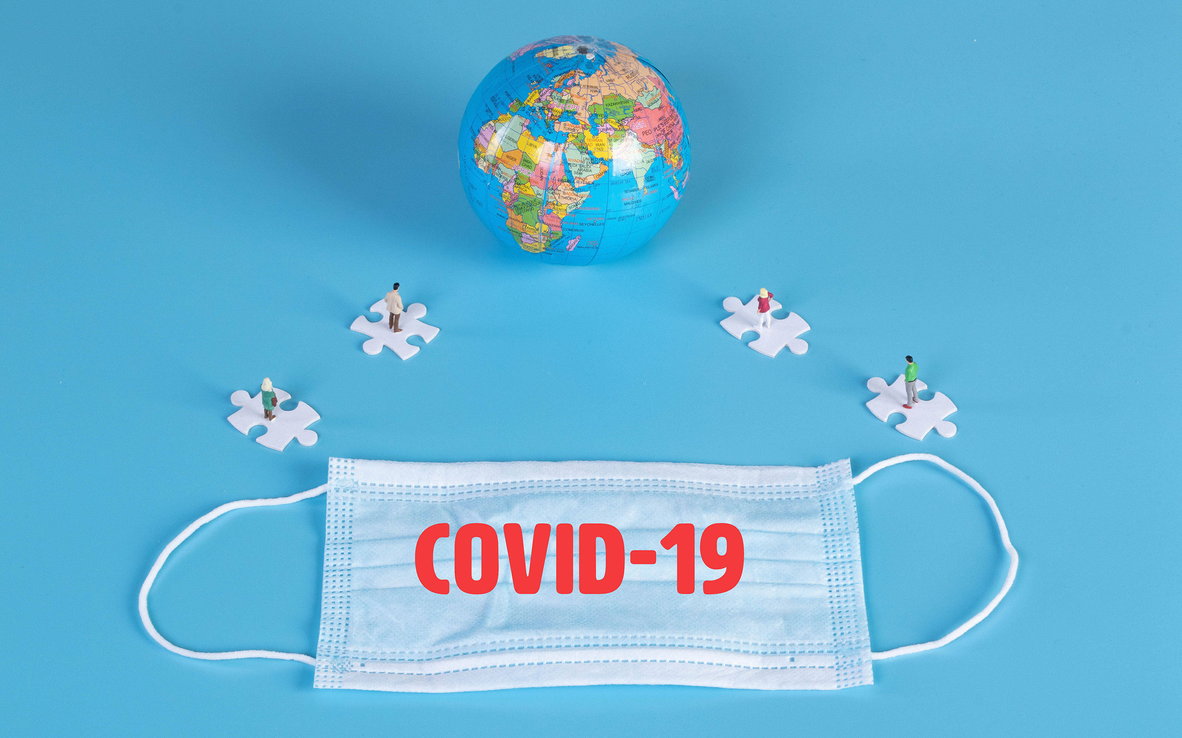 Description: A mask with the words covid - 19 on it and puzzle pieces surrounding it on a blue background.