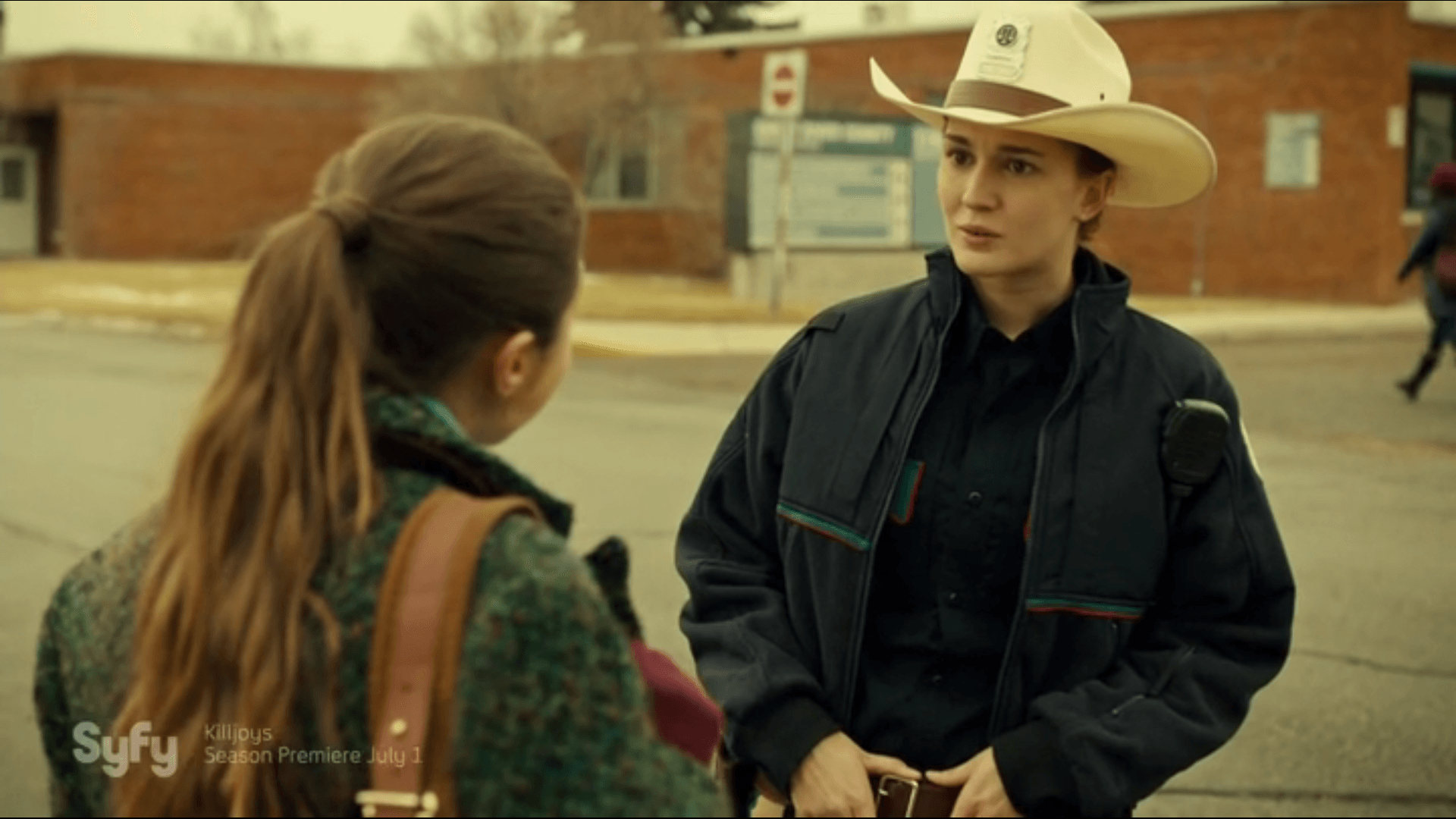 Description: A man in a cowboy hat talking to a girl in a green jacket and black jacket on a street.