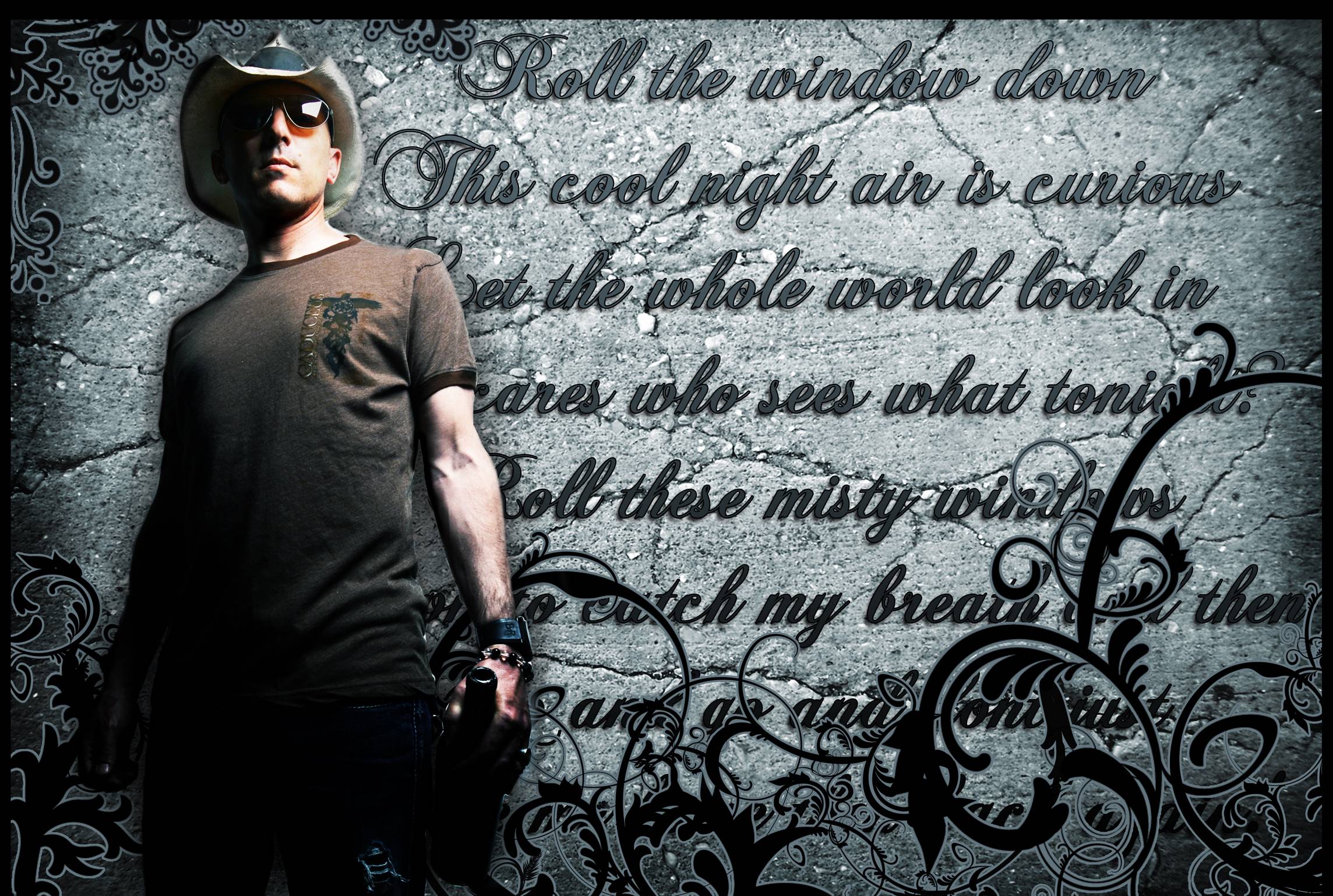 Description: A man wearing a cowboy hat and sunglasses standing in front of a wall with a quote on it that says.