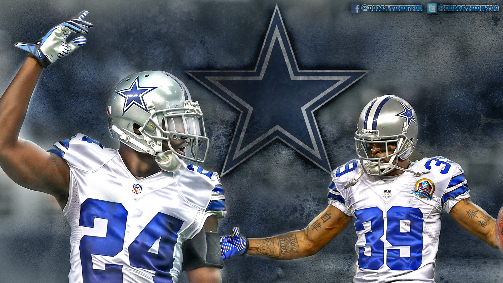 Description: Two cowboys players are holding their hands up in the air with one another and the other hand up in the air.