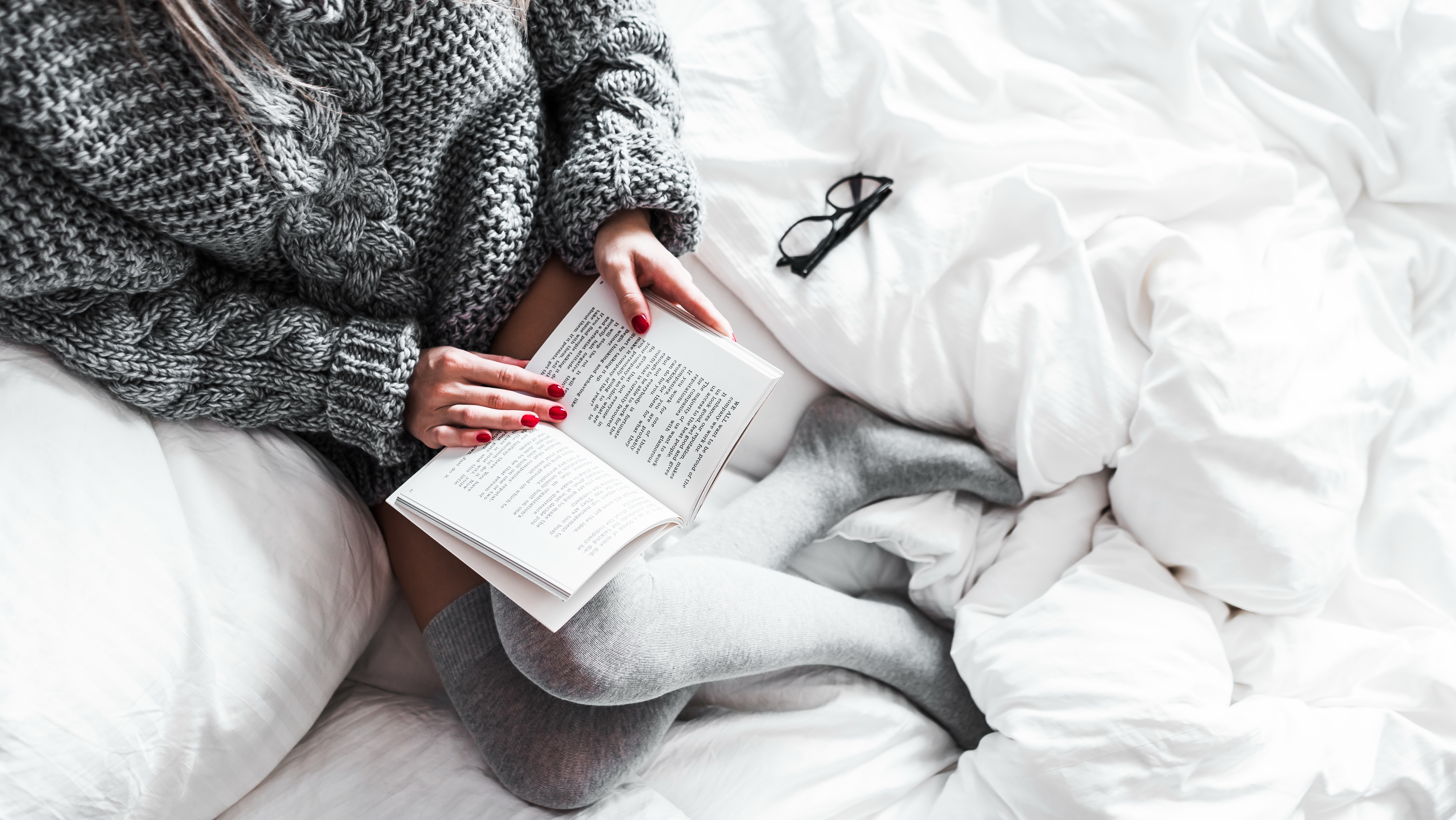 Description: A woman sitting on a bed with a book in her lap and a pair of glasses on her head.