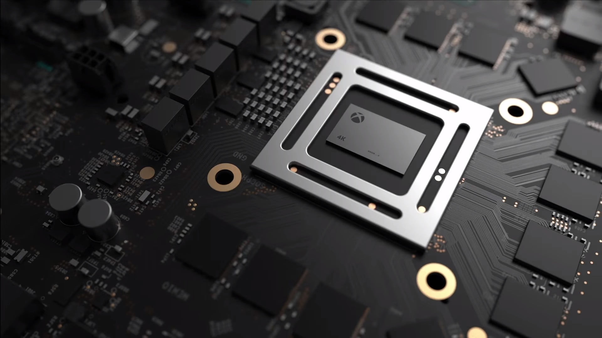 Description: A cpu chip on top of a computer motherboard with gold and black parts around it and a black background.