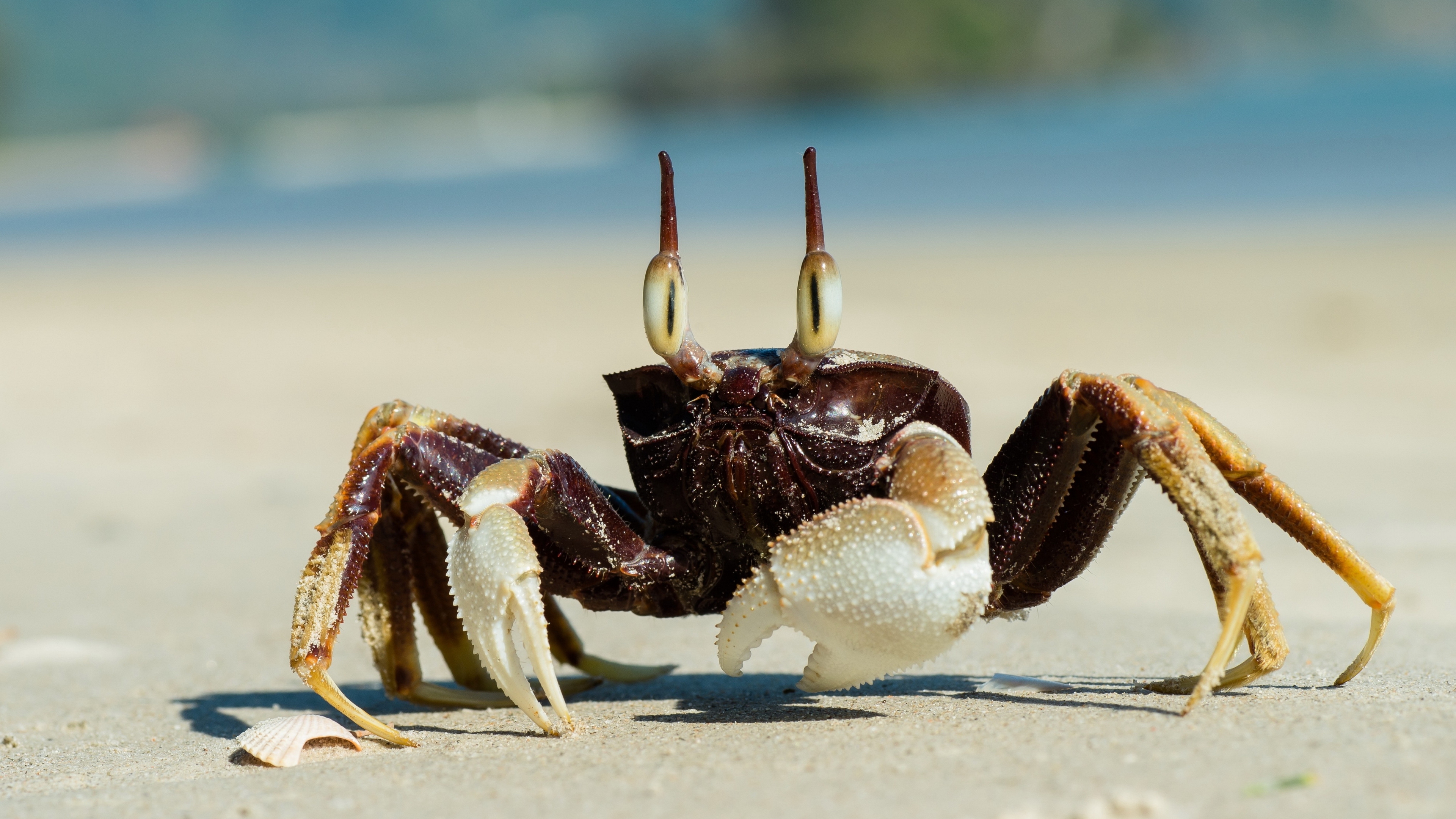 Description: A close up of a crab on a beach near the ocean water and sand with a blurry background.