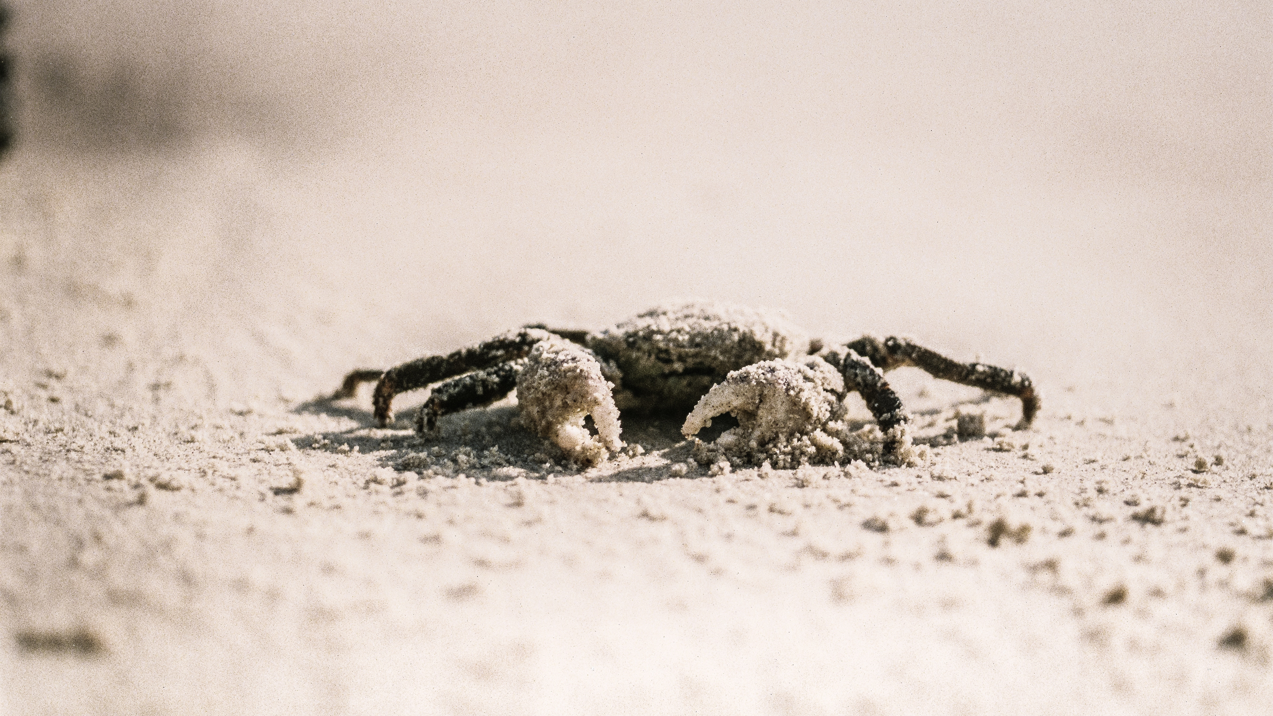 Description: A crab crawling on the sand in the sand dunes of a beach area.