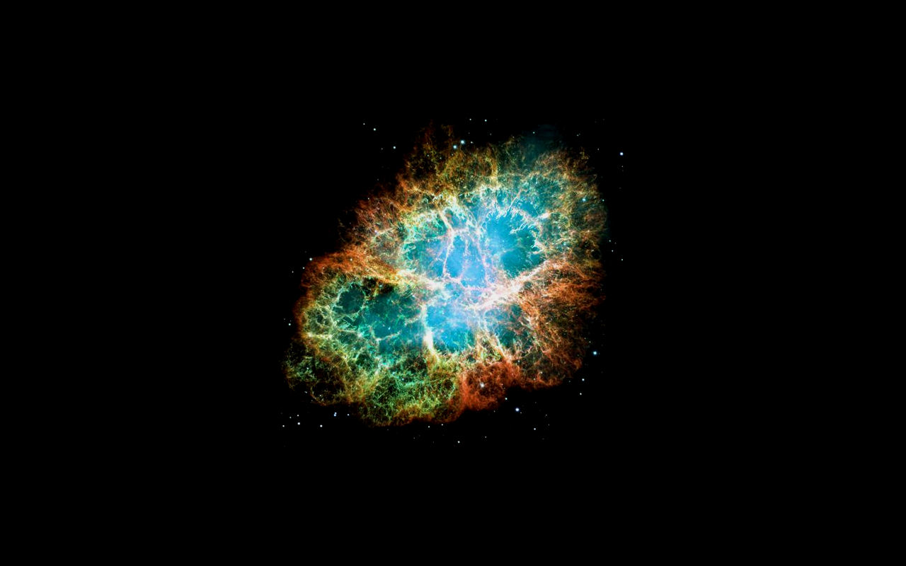 Description: A crab shaped object in the sky with a black background and a blue and orange color scheme.
