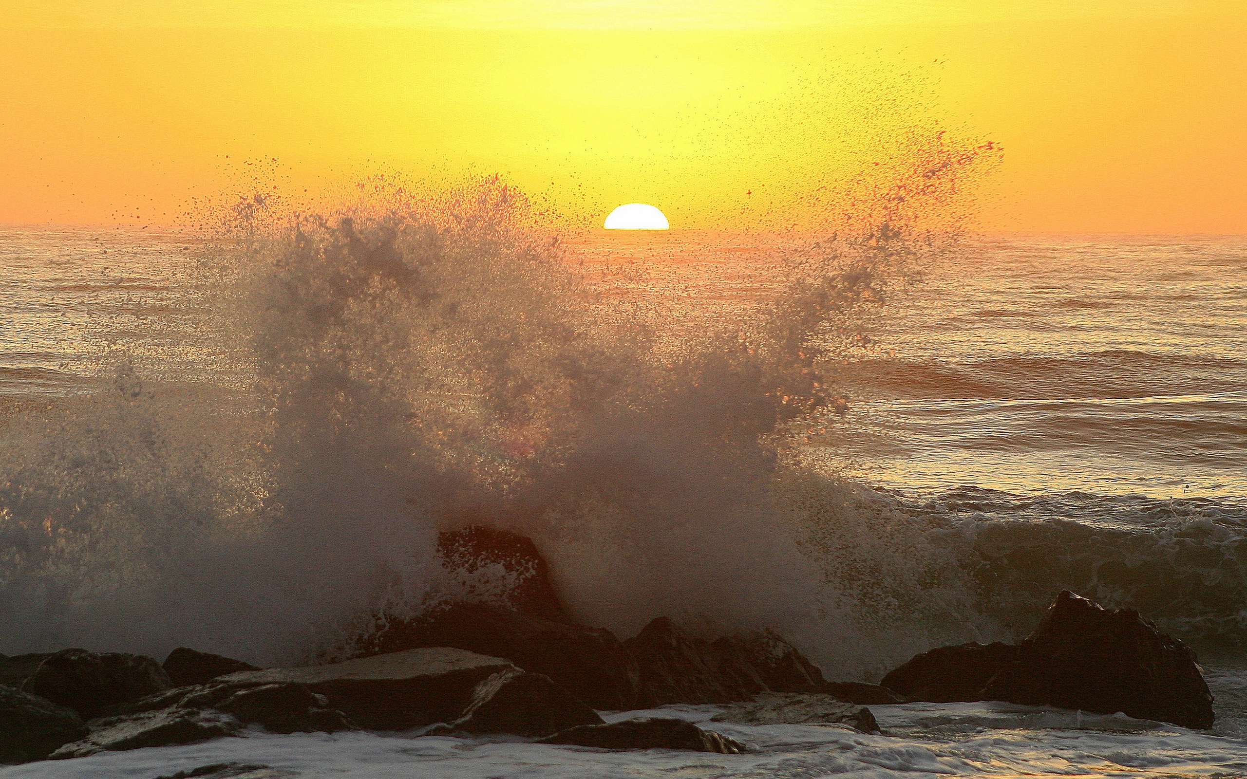 Description: A wave crashes against a rock at sunset on the ocean shore with the sun in the distance behind it.