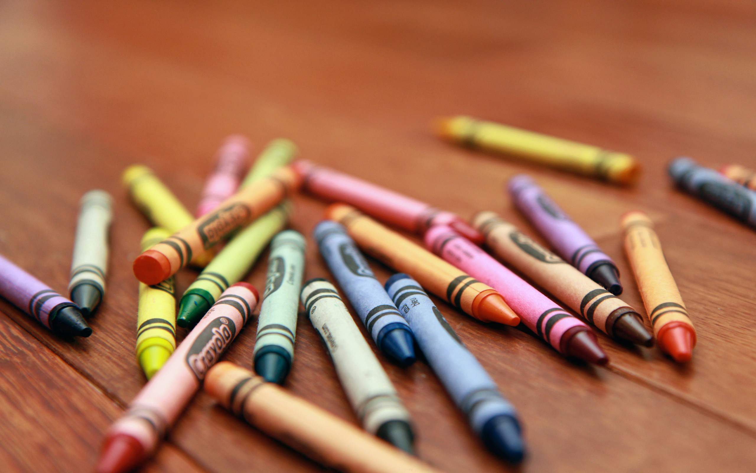 Description: A group of crayons sitting on top of a wooden table next to each other on a table.