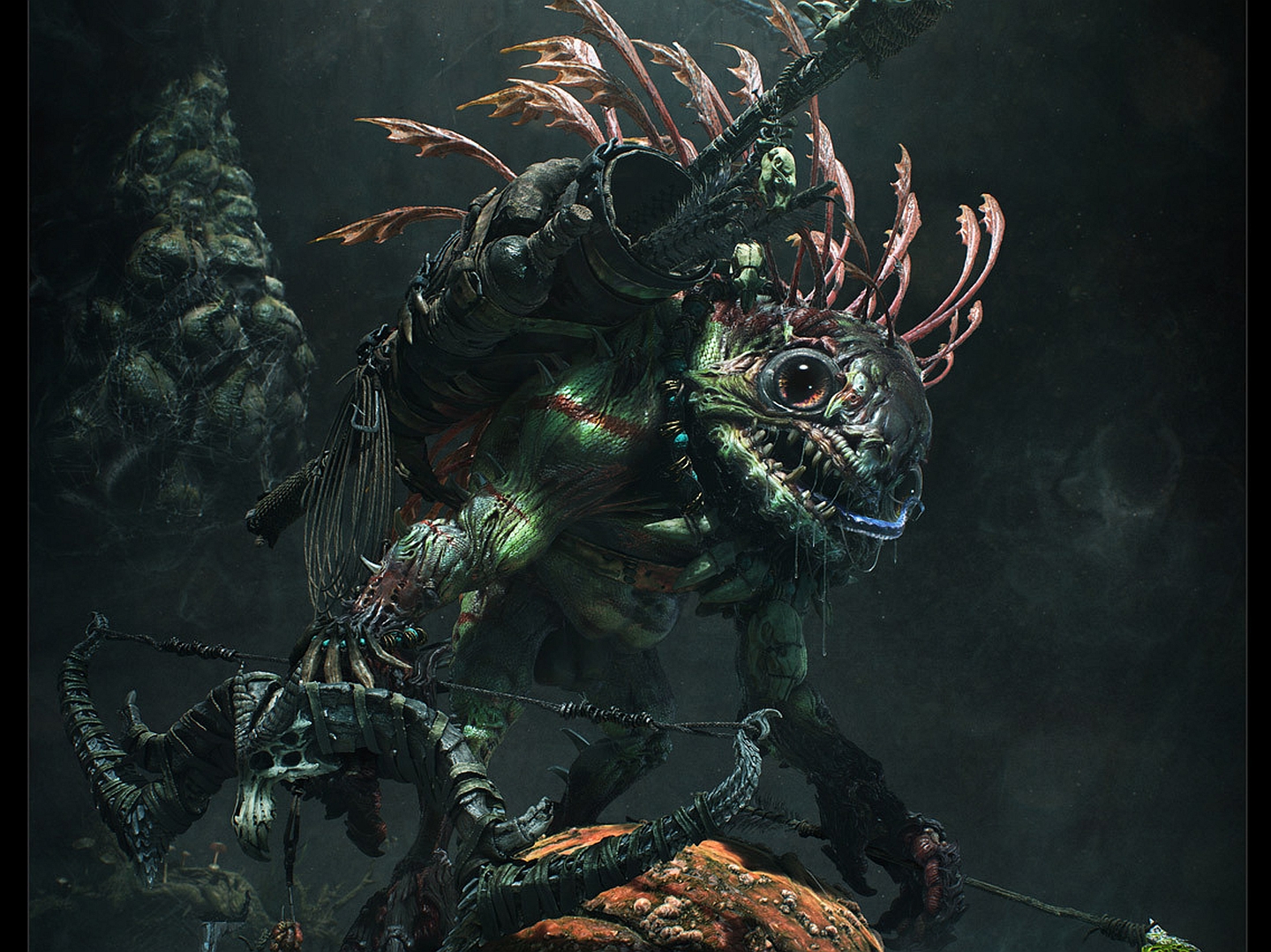 Description: A creature with a sword and a demon with a demon like head and tail.