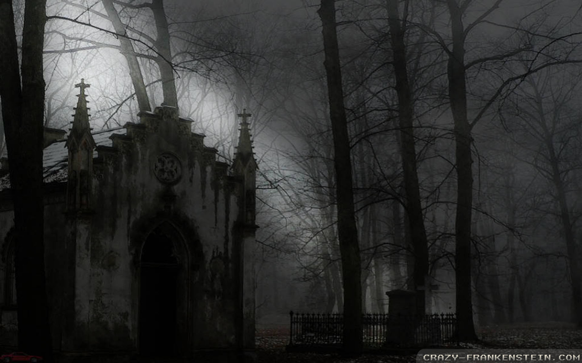 Description: A creepy castle in the woods with a full moon in the background and fog in the air above it.