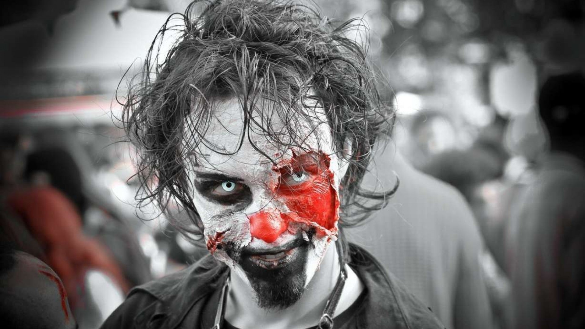 Description: A man with a clown makeup and a beard and red nose paint on his face and face is covered in hair.