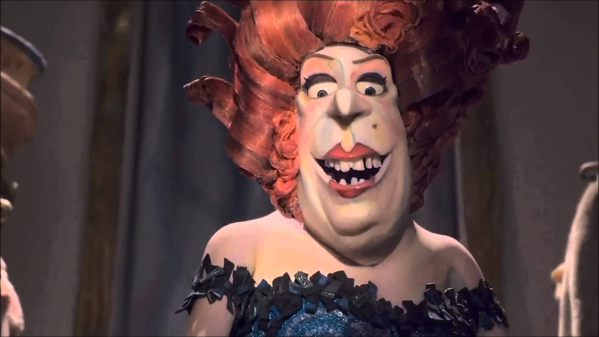 Description: A creepy clown with a red hair and a blue dress and a hat on his head and a black lace dress on his body.
