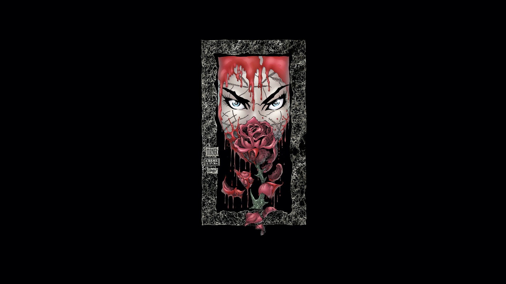 Description: A creepy clown with a rose in his mouth and a creepy face on his face.
