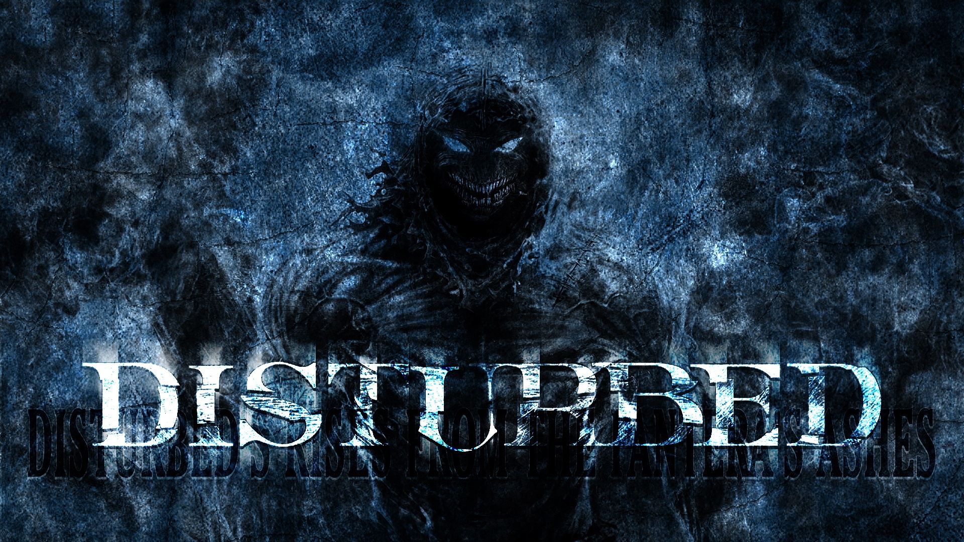 Description: A creepy looking creature with the word disturbed in front of it's face and head.