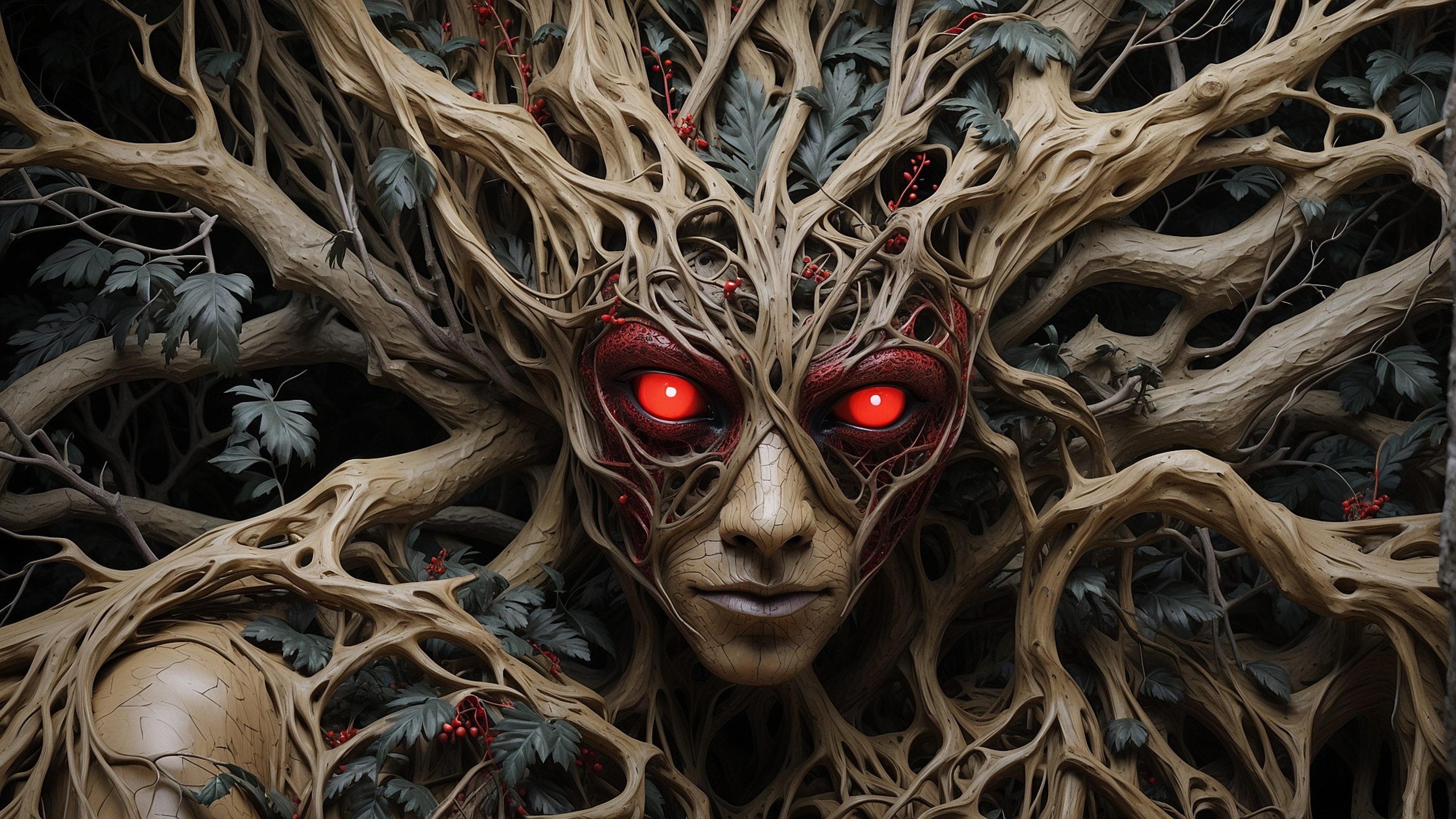 Description: A creepy looking face with red eyes surrounded by trees and vines with red eyes and branches on the face.