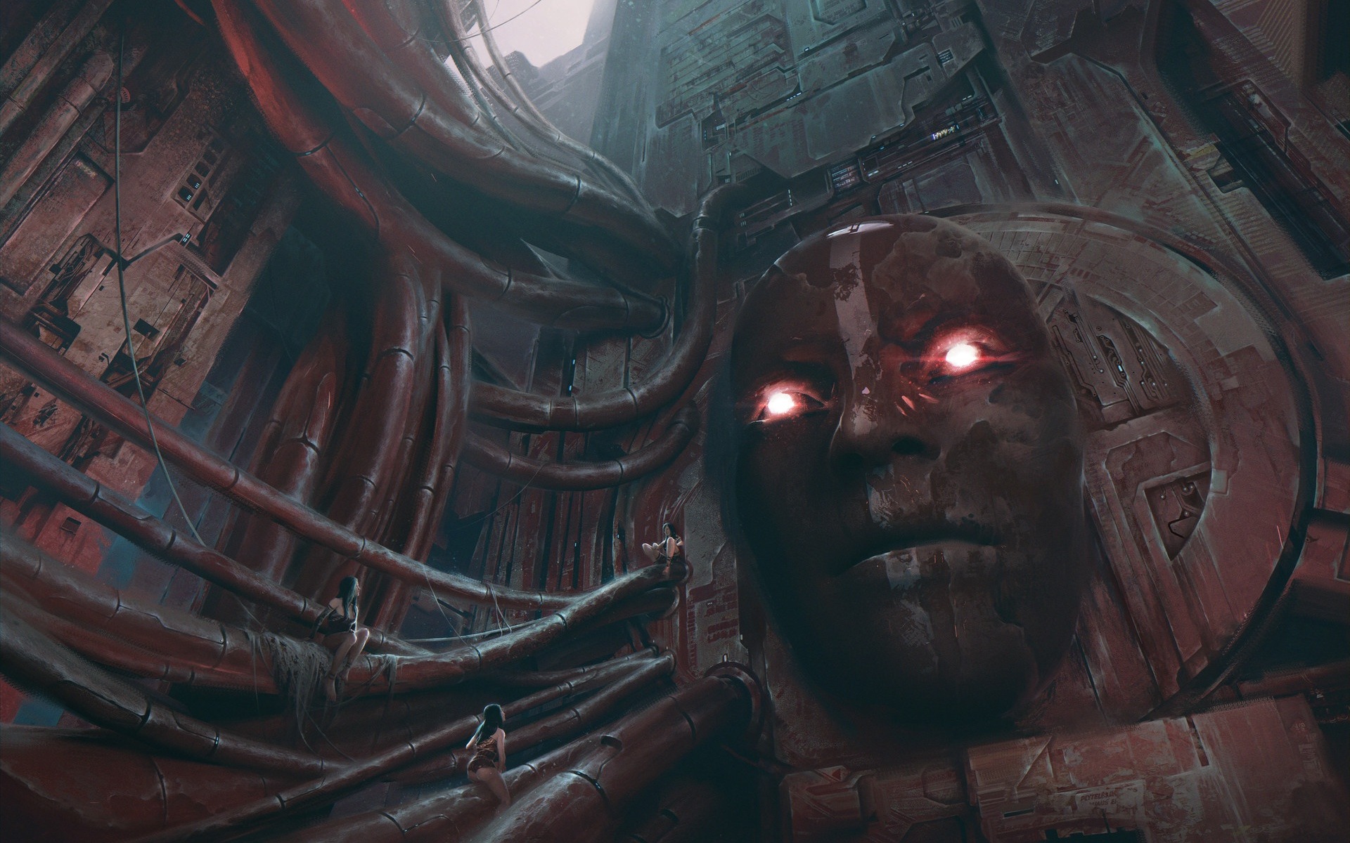 Description: A creepy looking face with glowing eyes in a dark room with a giant clock on the wall and a giant red light in the center.