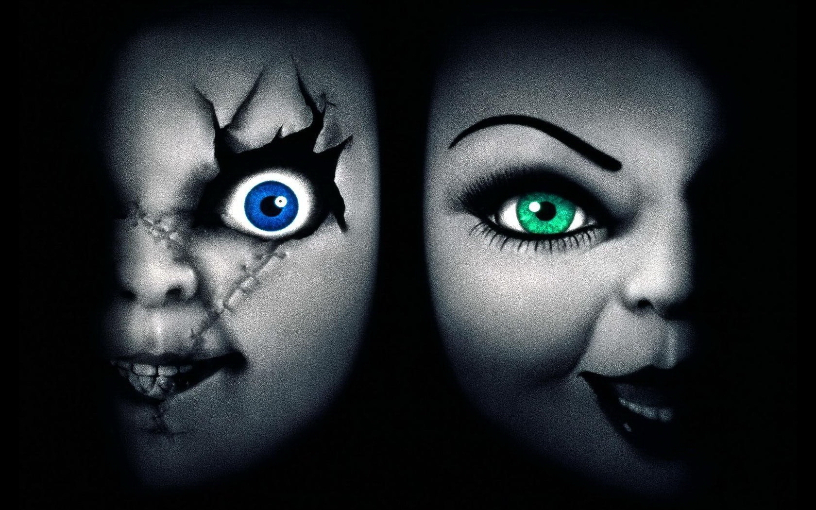 Description: Two creepy looking faces with green eyes and a creepy nose and nose makeup on them.