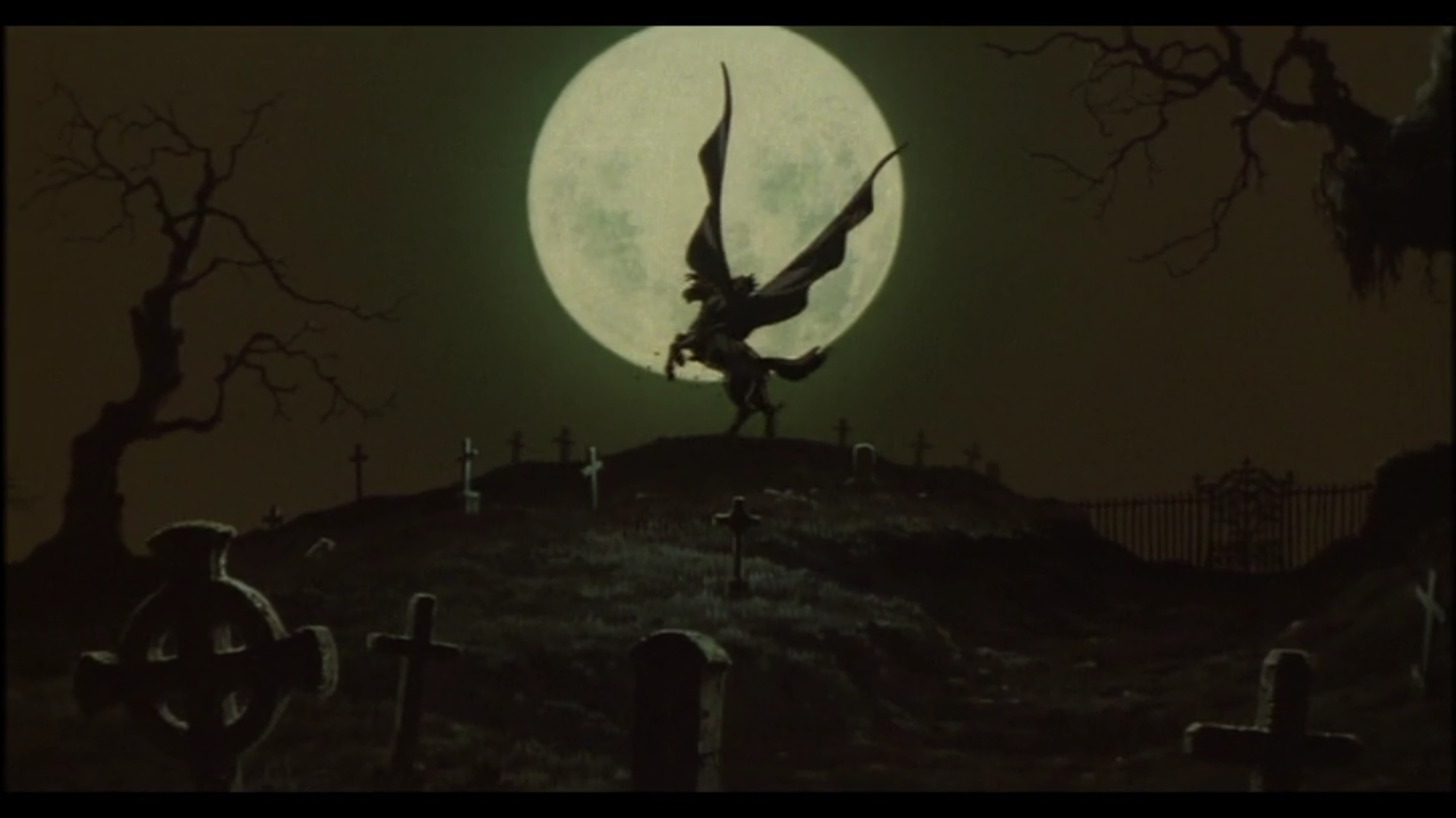 Description: A creepy halloween scene with a full moon in the background and a creepy scarecrow on a grave with a full moon in the background.