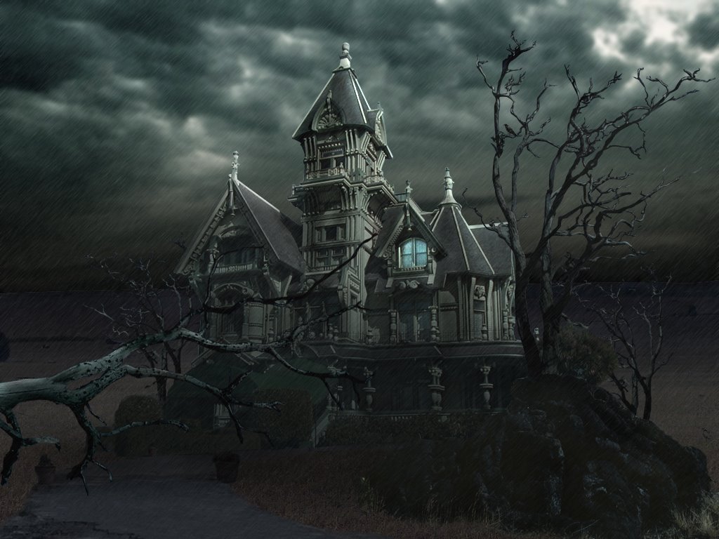 Description: A creepy house with a creepy tree in front of it and a dark sky in the background with clouds.