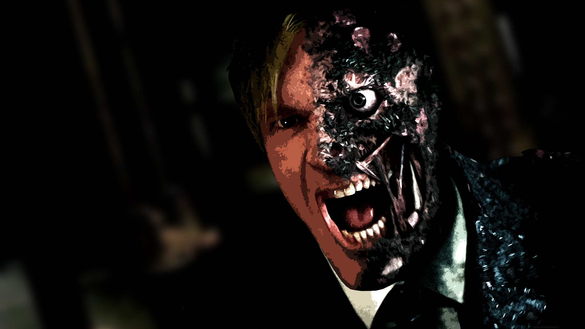 Description: A man with a creepy face and a black suit and tie with a black background and a black background.