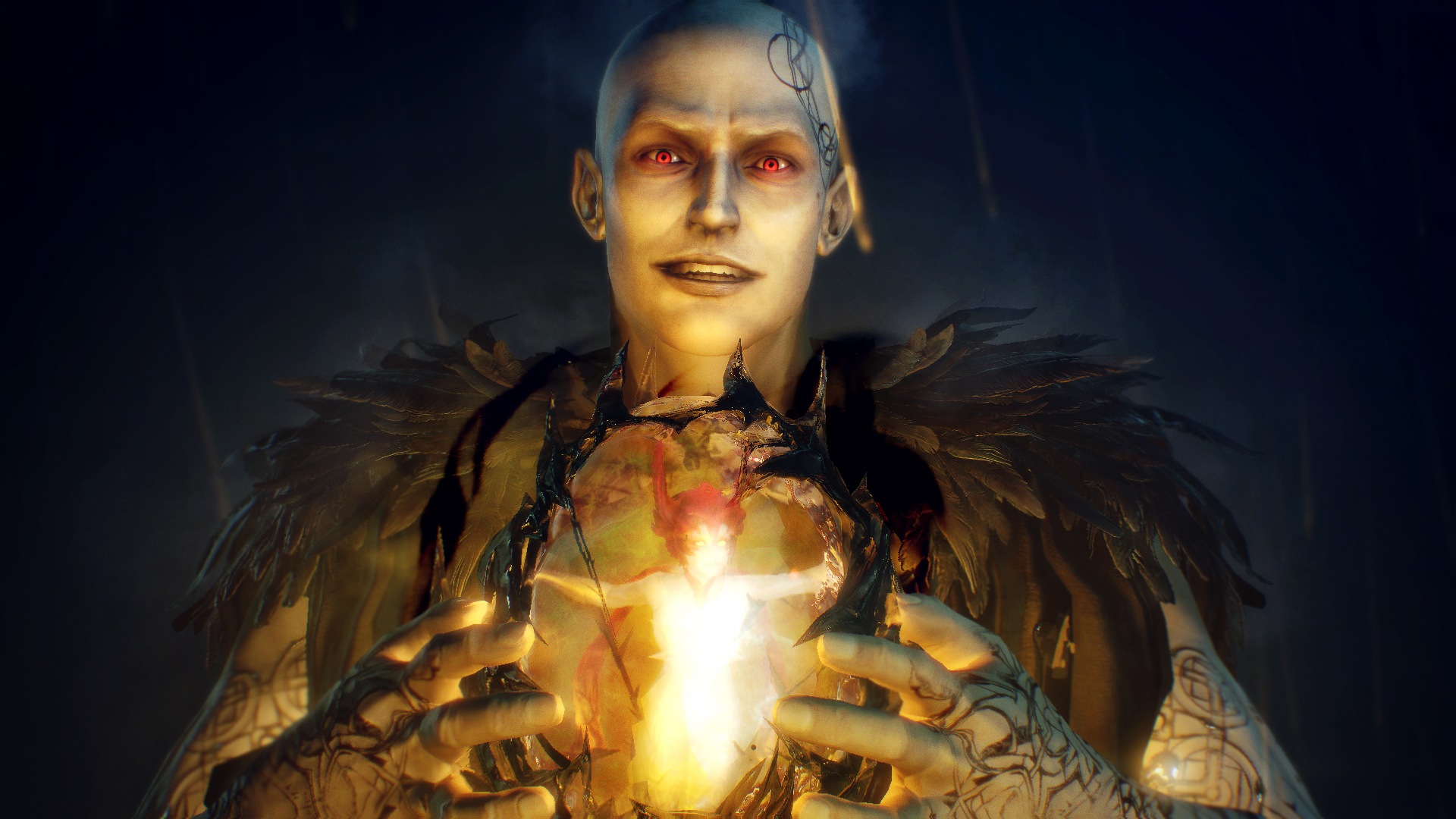Description: A creepy looking man holding a lit candle in his hands with a creepy look on his face and hands.