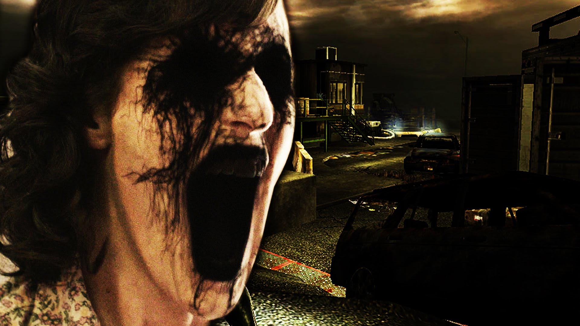 Description: A man with his mouth open and a creepy face on a street at night with a city in the background.