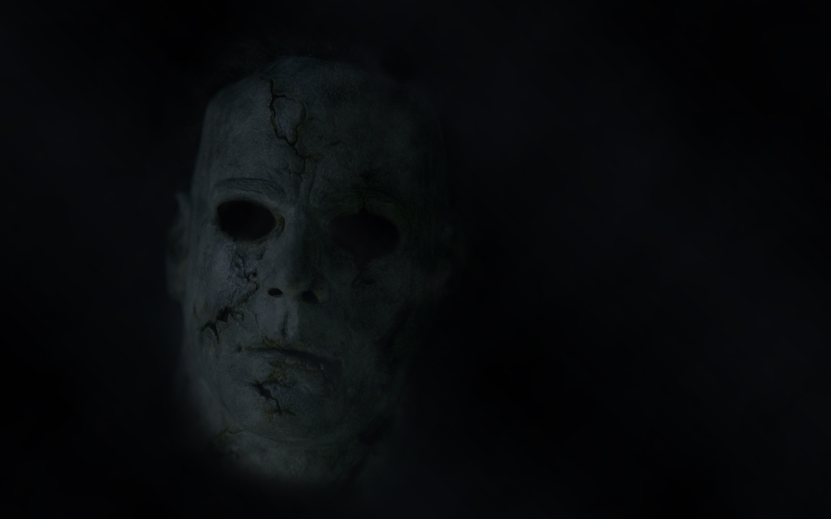 Description: A creepy mask is seen in the dark with a light shining on it's face and a black background.