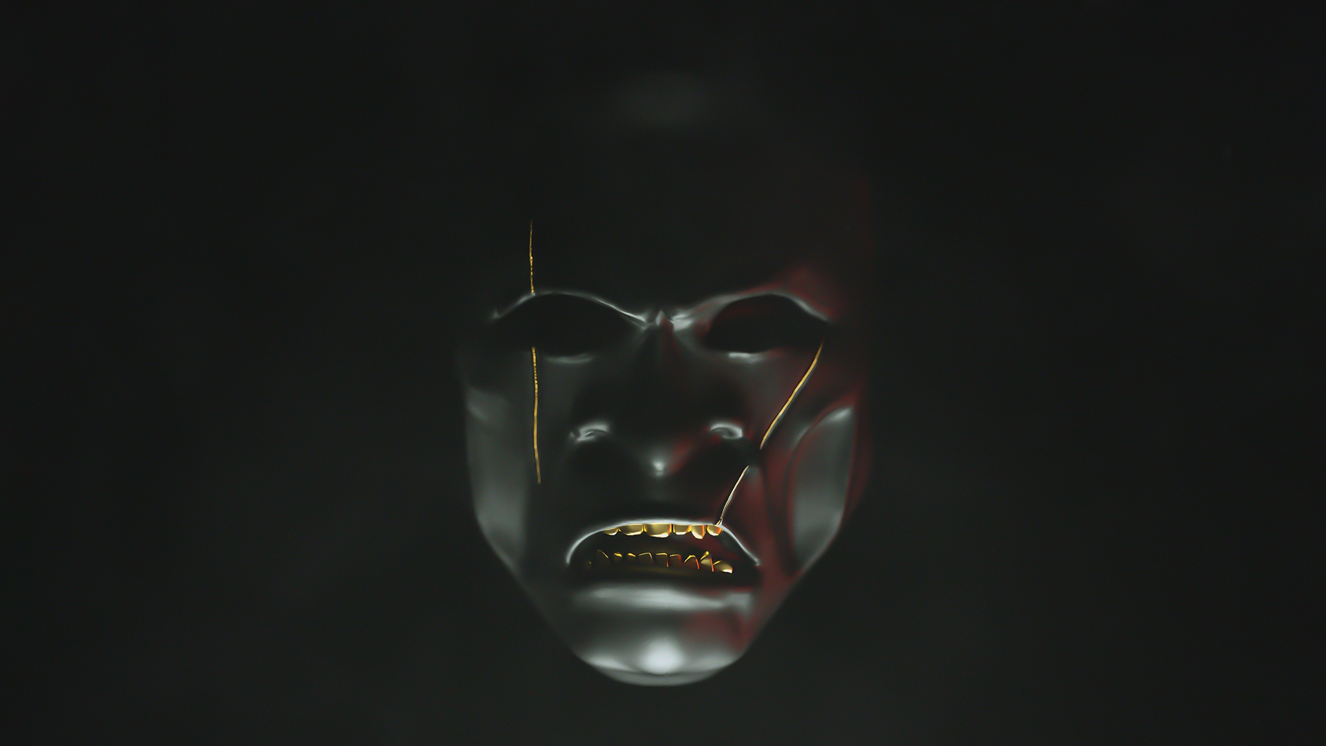 Description: A creepy mask with a yellow light on it's face and a black background with a yellow light on it's face.