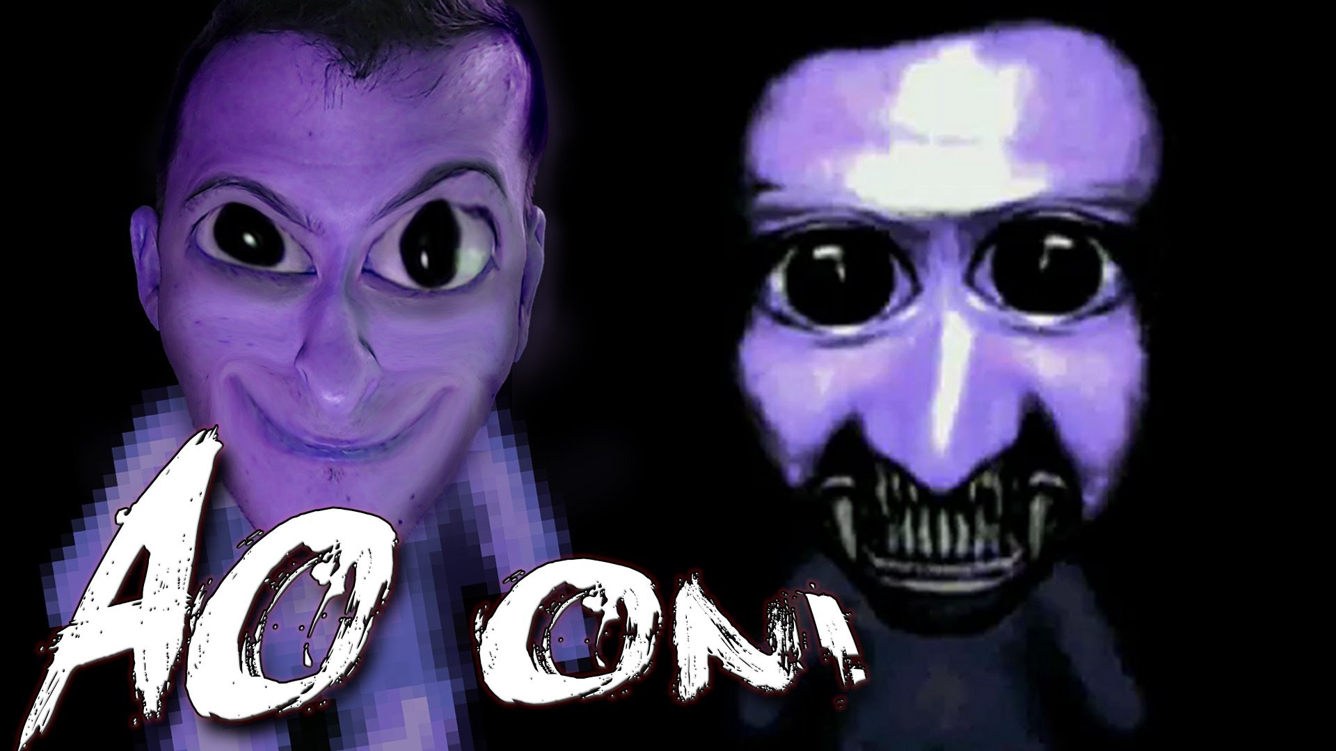Description: Two creepy looking men with the words ao on them in front of them with a black background and a purple background.