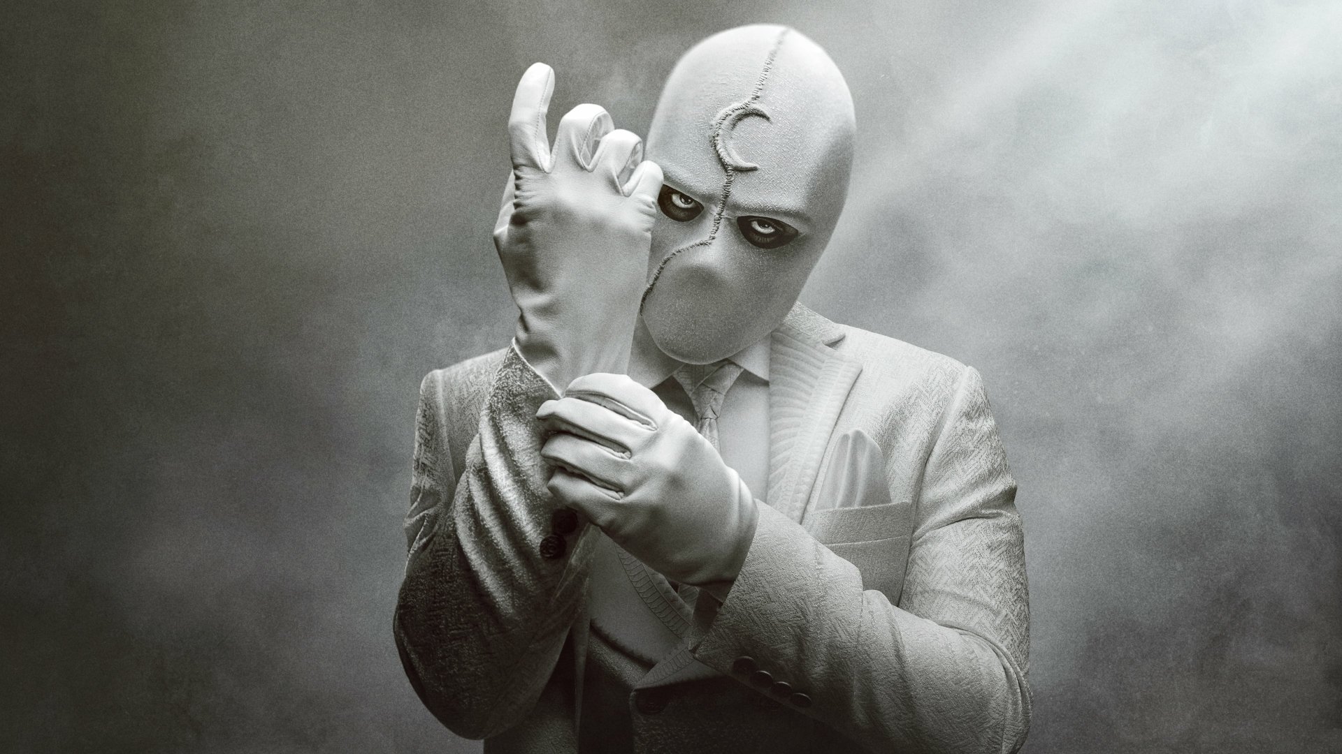 Description: A man in a suit and mask holding his hands up to his face with a creepy look on his face.