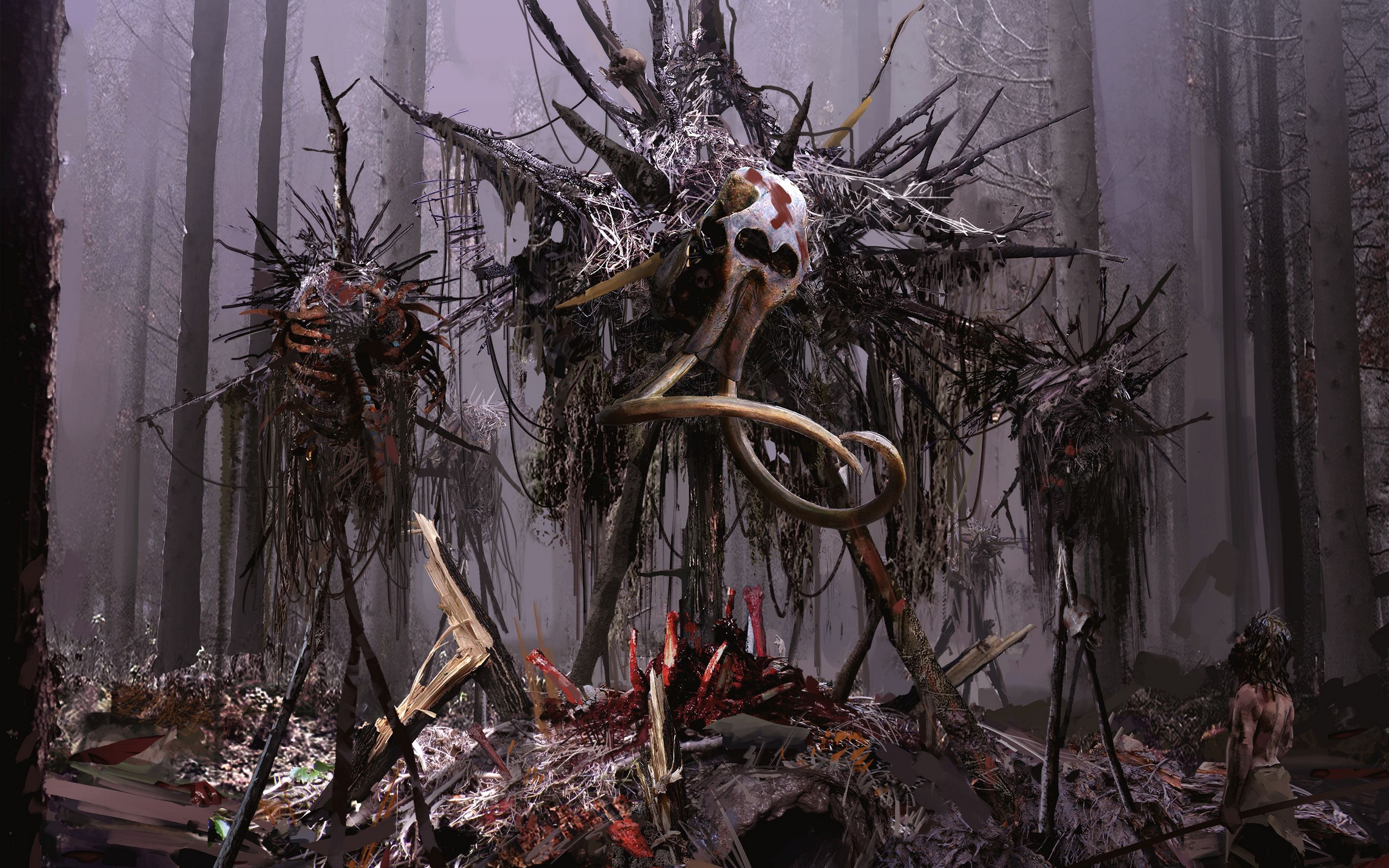 Description: A creepy looking tree with a bunch of dead animals on it's back legs and arms and legs.