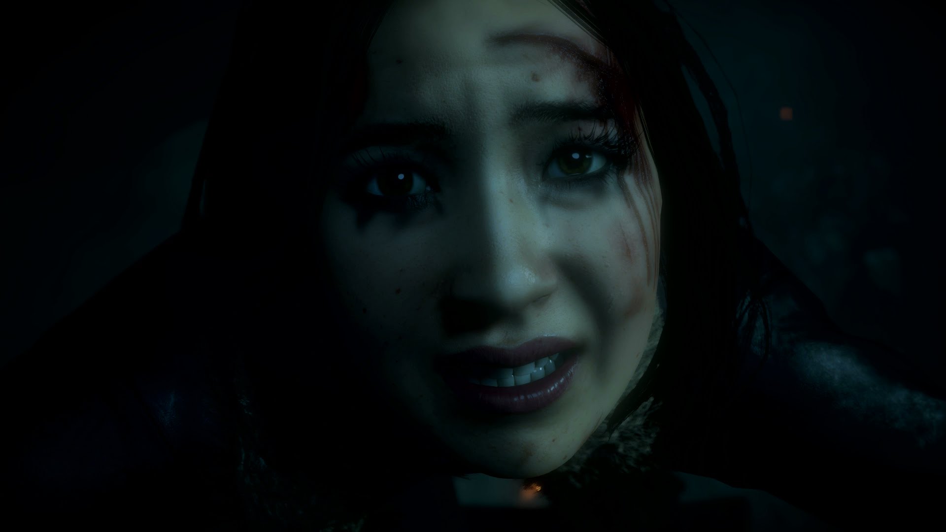 Description: A woman with dark makeup and a creepy look on her face in a dark room with a light on.