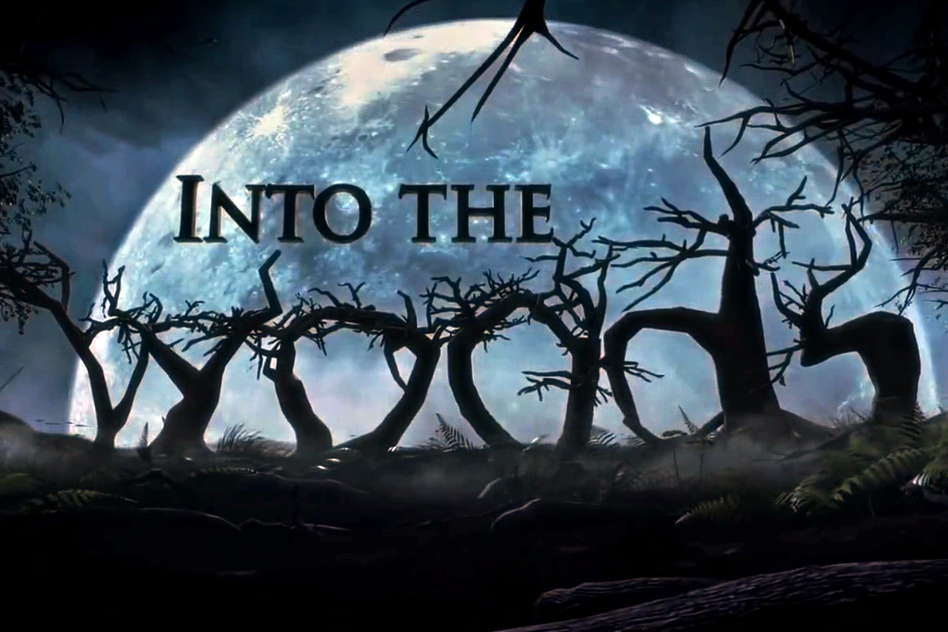 Description: A creepy scene with trees and a full moon in the background with the words into the woods written in the foreground.