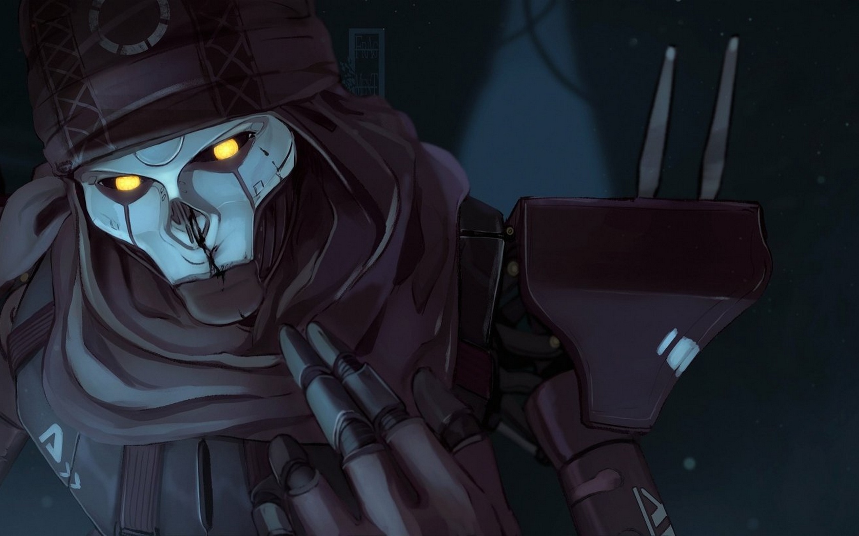 Description: A creepy looking character with yellow eyes holding a gun in his hand and wearing a hat and scarf with a hood.
