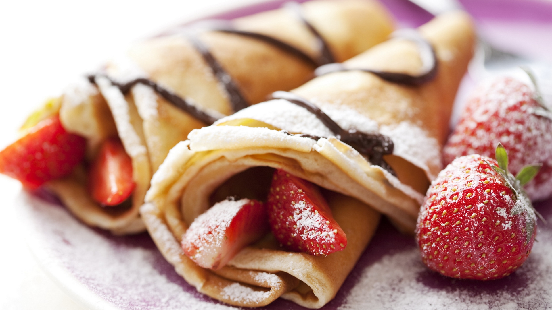Description: A plate with a crepe and strawberries on it and a fork and knife on the side.