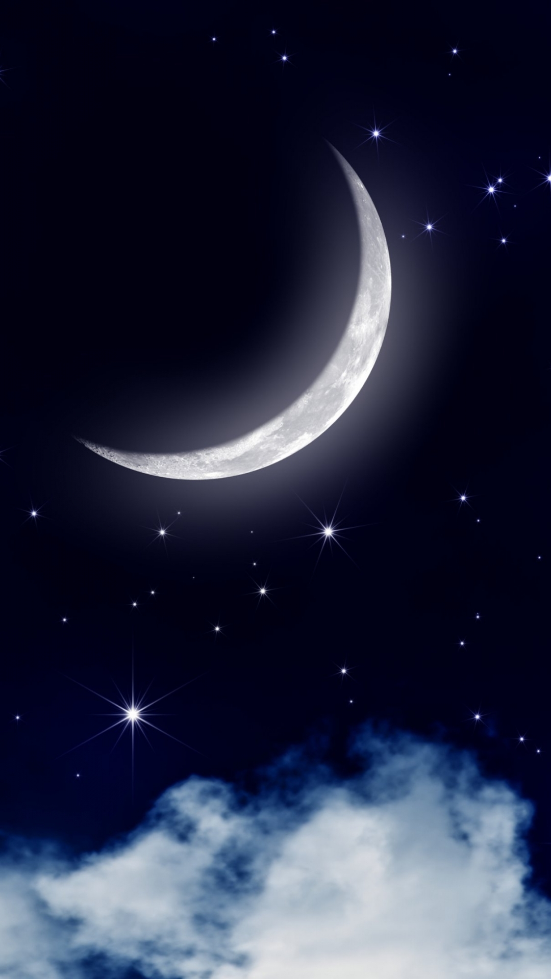 Description: A crescent moon in the night sky with stars and clouds below it.